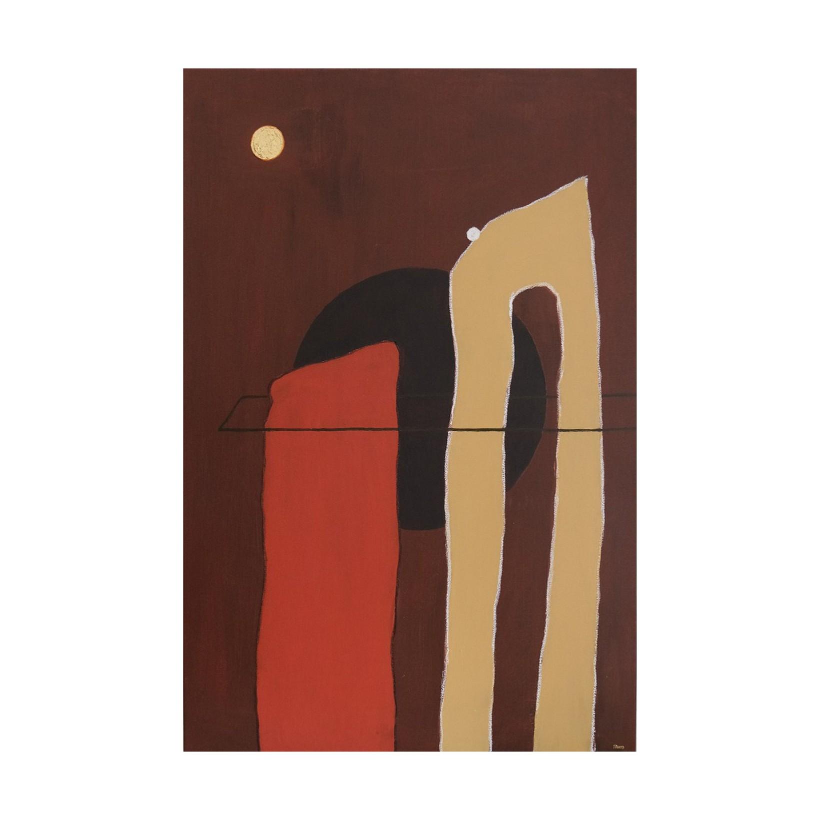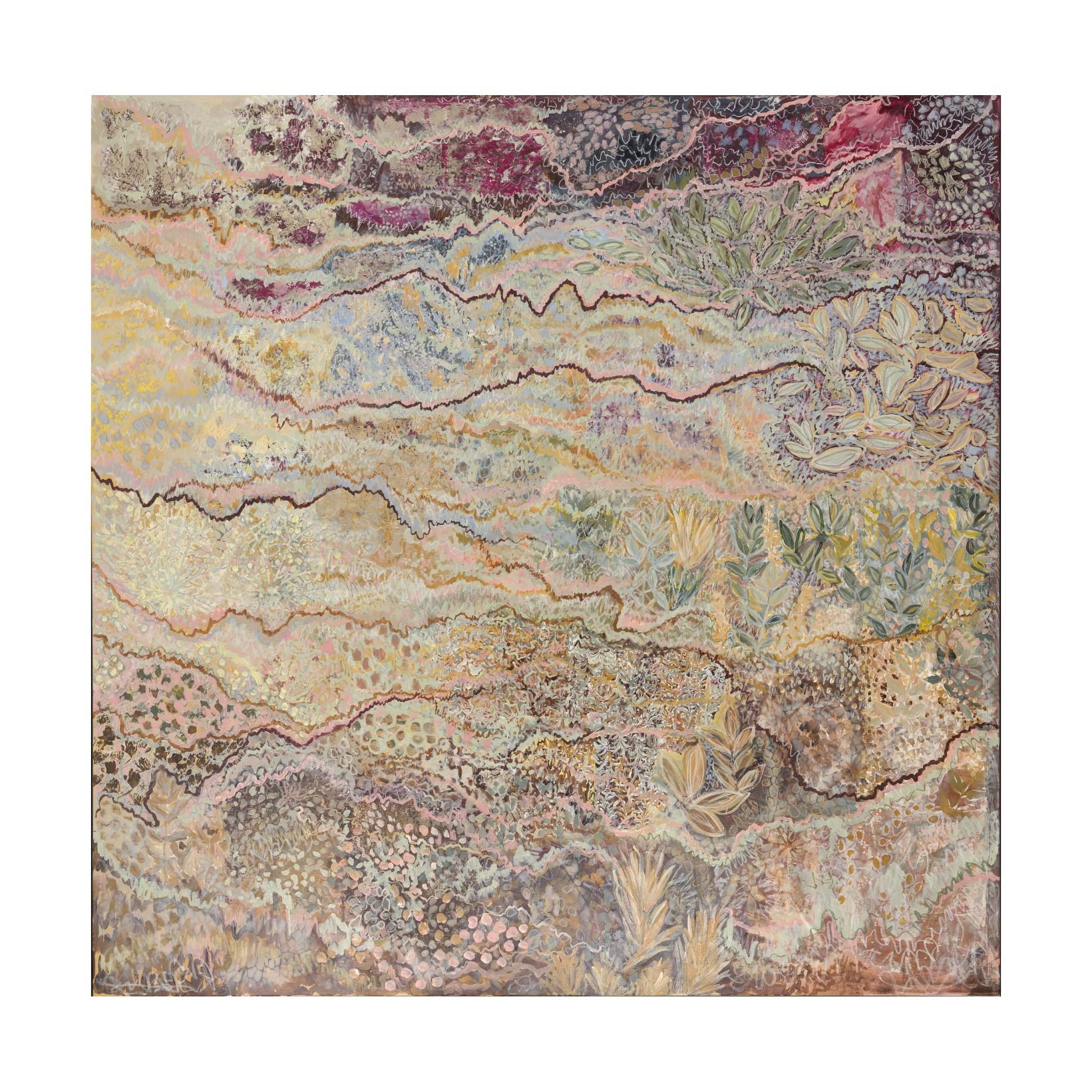 acrylic, ink, gold leaf, oil pastel and coffee on stretched canvas. framed in flooded gum. (framed)