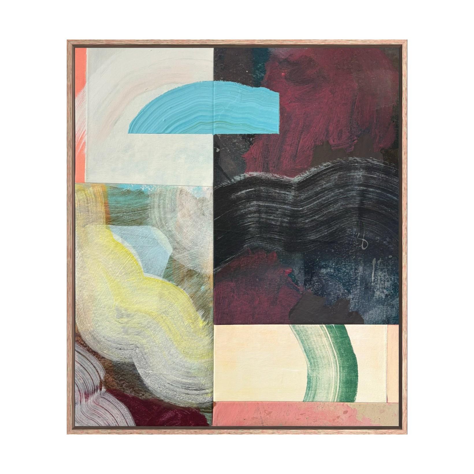 acrylic & oil stick on canvas, with sewn assemblage. hand framed in oak. (framed)