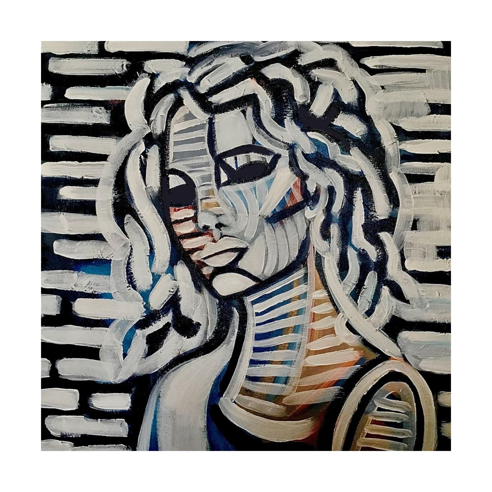 acrylic, oil pastel, and oil paint on canvas, framed in natural timber. (framed)