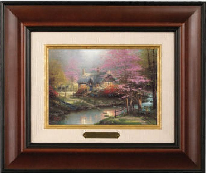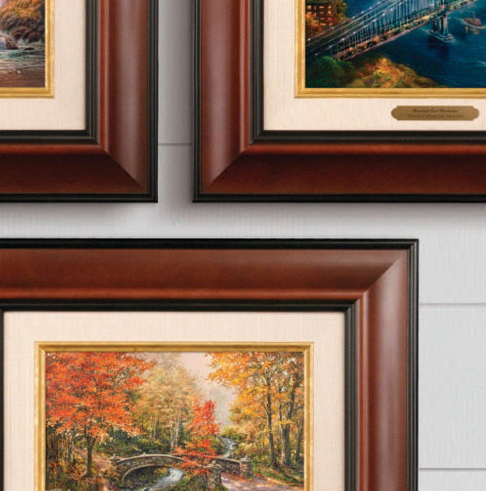 Framed Metal Prints combine two rugged materials, metal and wood, to create a modern take on a vintage style. Thomas Kinkade Studios art is printed with an antique patina on metal and is hand-finished by master framers in a solid wood frame. The colors and textures of this artwork perfectly complement each other, achieving an enduring handcrafted look.