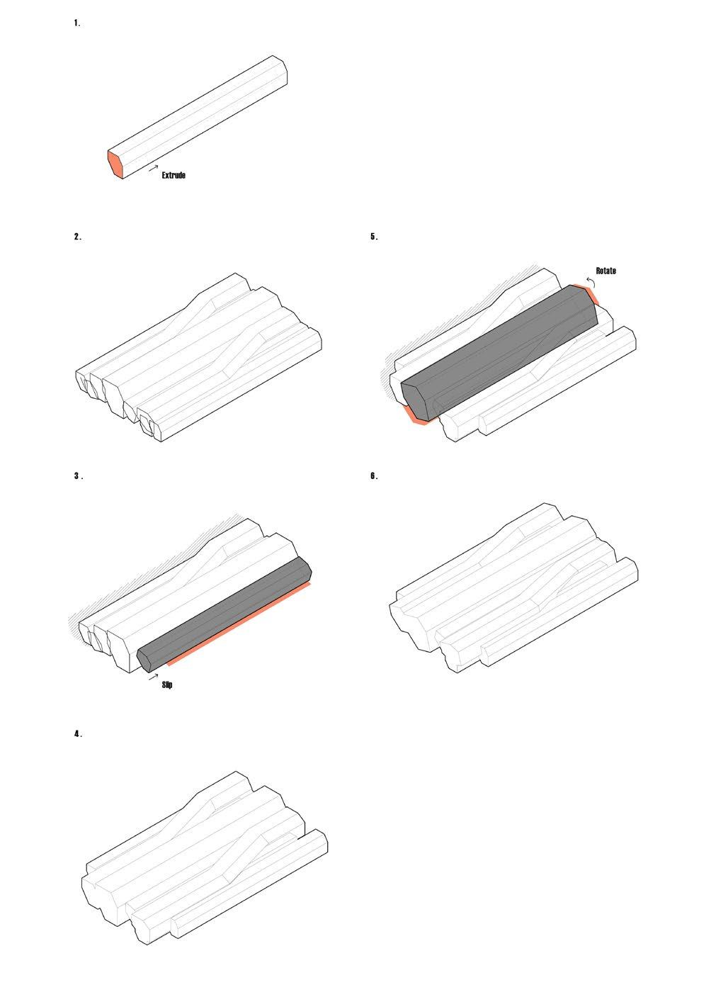 The diagrams below depict a series of rotations that were employed during the project’s development. With each turn and rotation, you lose what is known as SCI-Arc in favor of something new.
