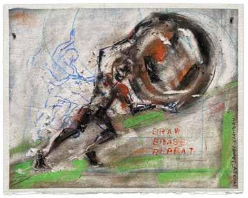 “This drawing appealed to me because, with a few marks, the artist made me think of the Greek story of Sisyphus. Sisyphus rolled the boulder up the hill, only to see his hard labor roll back down. He repeats the task the next day in an endless cycle. With Sisyphus in mind, I erased and redrew the drawing every day until the paper started to fall apart.”