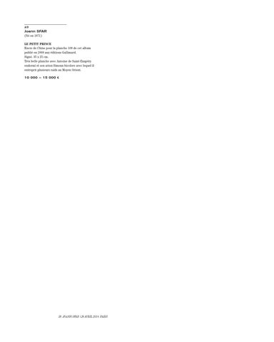 (Né en 1971) LE PETIT PRINCE Encre de Chine pour la planche 109 de cet album publié en 2008 aux éditions Gallimard. Signé. 35 x 25 cm. Très belle planche avec Antoine de Saint-Exupéry endormi et son avion Simoun bicolore avec lequel il entreprit plusieurs raids au Moyen Orient. 10 000 — 15 000 €