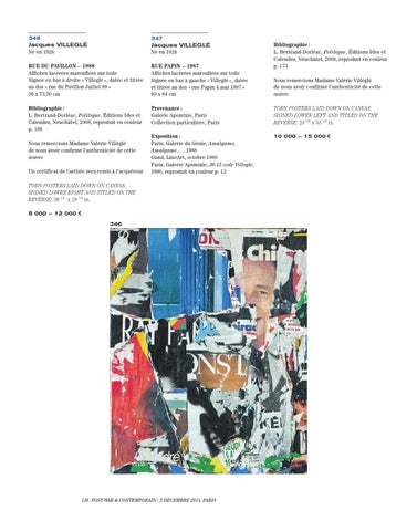 Nous remercions Madame Valérie Villéglé de nous avoir confirmé l’authenticité de cette œuvre Un certificat de l’artiste sera remis à l'acquéreur TORN POSTERS LAID DOWN ON CANVAS, SIGNED LOWER RIGHT AND TITLED ON THE REVERSE; 36 1/4 x 28 7/8 in. 8 000 – 12 000 € 346
