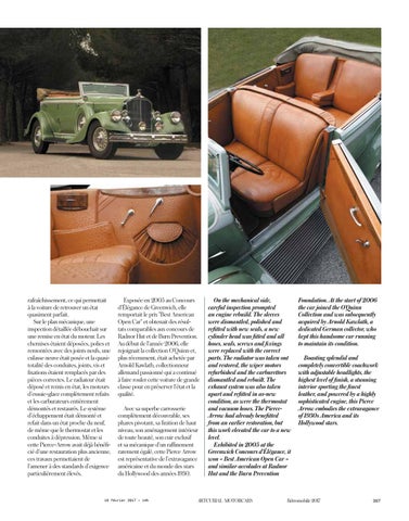rafraîchissement, ce qui permettait à la voiture de retrouver un état quasiment parfait. Sur le plan mécanique, une inspection détaillée débouchait sur une remise en état du moteur. Les chemises étaient déposées, polies et remontées avec des joints neufs, une culasse neuve était posée et la quasitotalité des conduites, joints, vis et fixations étaient remplacés par des pièces correctes. Le radiateur était déposé et remis en état, les moteurs d'essuie-glace complètement refaits et les carburateurs entièrement démontés et restaurés. Le système d'échappement était démonté et refait dans un état proche du neuf, de même que le thermostat et les conduites à dépression. Même si cette Pierce-Arrow avait déjà bénéficié d'une restauration plus ancienne, ces travaux permettaient de l'amener à des standards d'exigence particulièrement élevés.