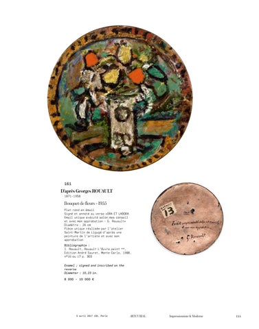 Bouquet de fleurs - 1955 Plat rond en émail Signé et annoté au verso «ORA ET LABORA Email unique exécuté selon mes conseil et avec mon approbation - G. Rouault» Diamètre : 26 cm Pièce unique réalisée par l’atelier Saint-Martin de Ligugé d’après une peinture de l’artiste et avec son approbation Bibliographie : I. Rouault, Rouault L’Œuvre peint **, Edition André Sauret, Monte Carlo, 1988, n°16 ou 17 p. 303 Enamel ; signed and inscribed on the reverse Diameter : 10,23 in.