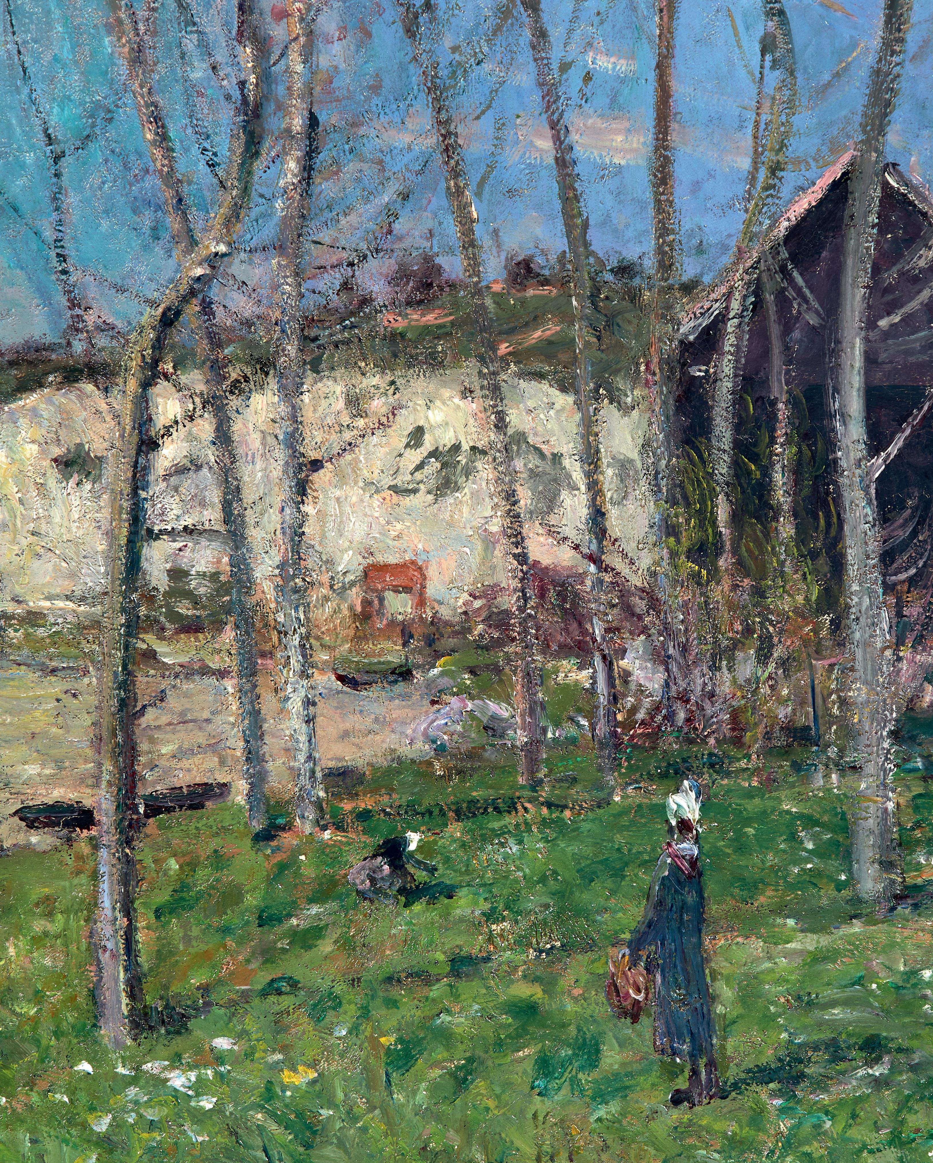 Peint près d’Isigny en Normandie vers 1855-60, Le matin sous les arbres propose une comparaison fascinante avec le tableau qui lui sert d’étude, La Bacchante, présenté au Salon de 1865. Alors que le tableau du Salon illustre les compositions lyriques de Corot dans les années 1860 et exprime sa retraite avouée du monde extérieur, peinte par touches fines et légères et peuplée d’une figure arcadienne et d’angelots ailés, l’œuvre actuelle est beaucoup plus naturaliste et s’apparente aux peintures en plein air de Courbet, des premiers Pissarro, de Monet et de Sisley. Cela montre que même si, dans ses œuvres exposées au public, Corot prenait ses distances par rapport à l’envahissant monde moderne, ces souvenirs poétiques étaient toujours fondés sur des observations très réelles