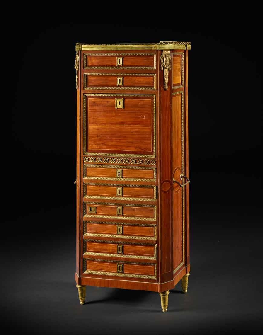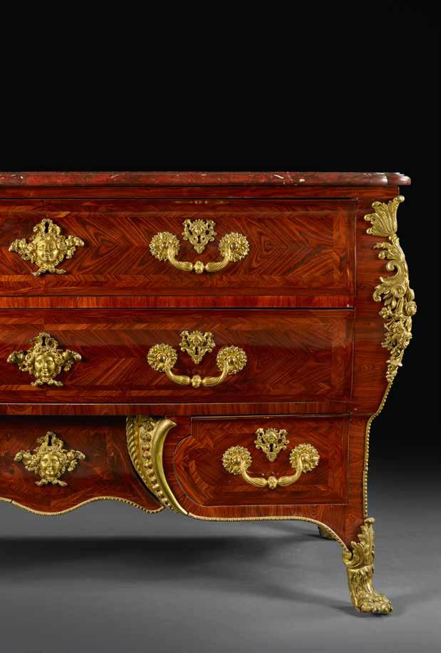 des pieds en forme de griffes de lion, ou bien, sur l’ancienne commode Couderc, des chutes à têtes de mascarons féminins coiffées de palmettes. De plus, les trois meubles sont réalisés en placage de bois de violette à chevrons et sont coiffés de dalles en marbre rouge griotte.