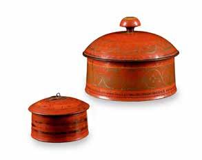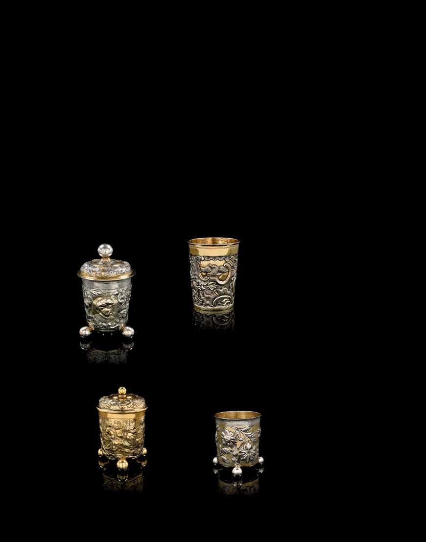 Posant sur trois pieds boule, le décor au repoussé de feuillages et bustes de turcs et d’empereurs romains dans des médaillons à fond amati ; gravé postérieurement sous le fond ‘84 / F.’ ; accidents, restaurations, modification de la prise du couvercle H. : 16,5 cm (6 ½ in.)