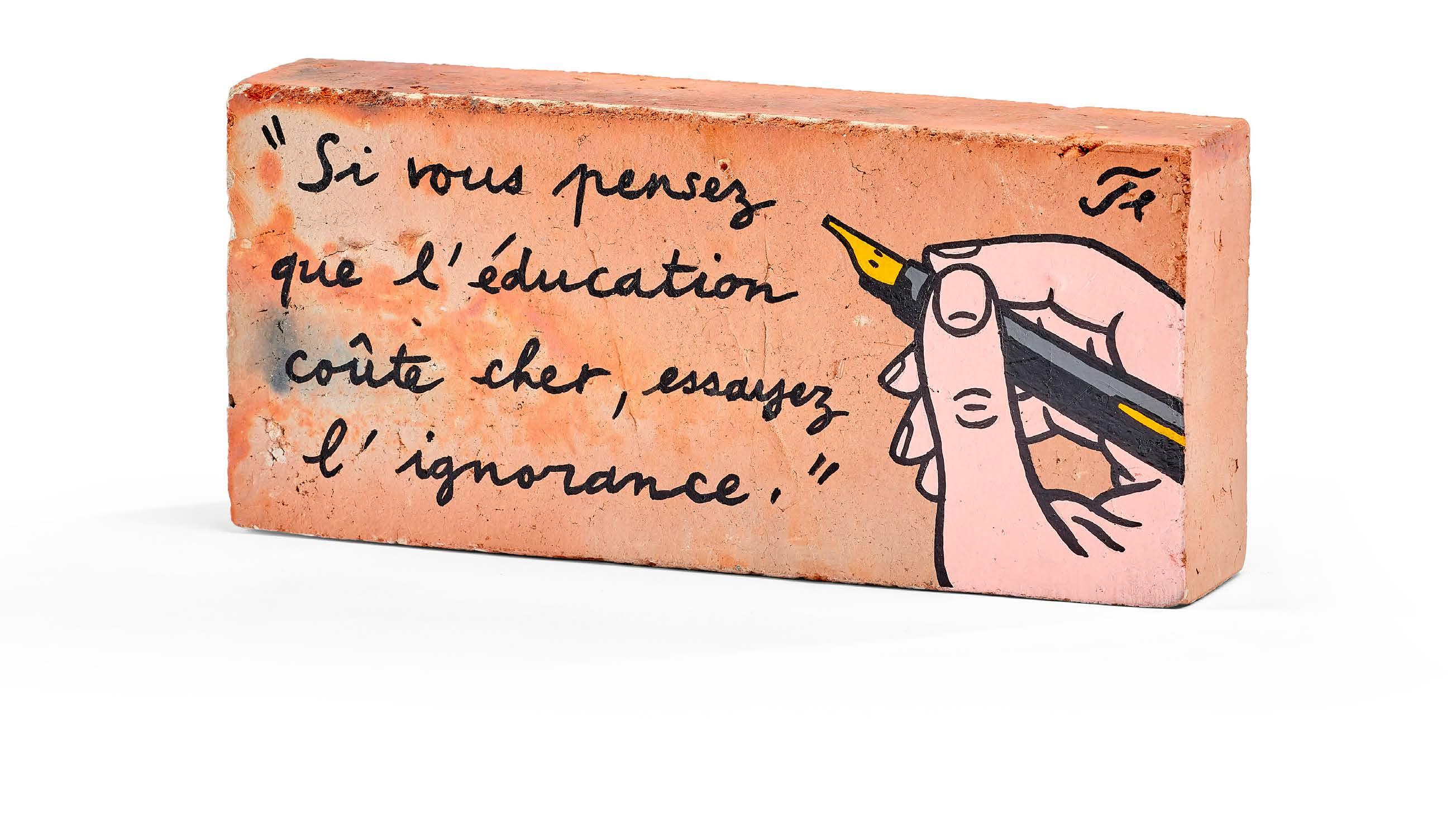 Grâce aux deux ventes précédentes (2011 et 2013), notre association Écoles du Monde a pu construire des écoles, former des instituteurs et des professeurs, et contribuer à la sédentarisation des populations rurales. Toutes nos écoles sont édifiées en briques : c’est donc tout naturellement que nous avons proposé à ces artistes d’exercer leur créativité sur ce support symbolique.