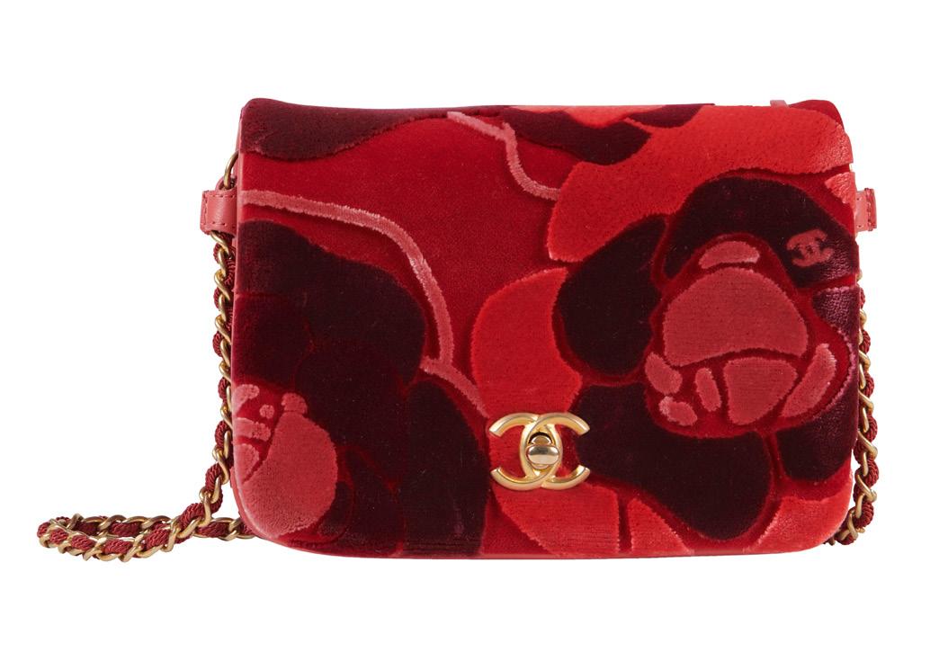 Flap bag Red, pink and burgundy velvet featuring camellias, pink leather Gilt metal hardware *****