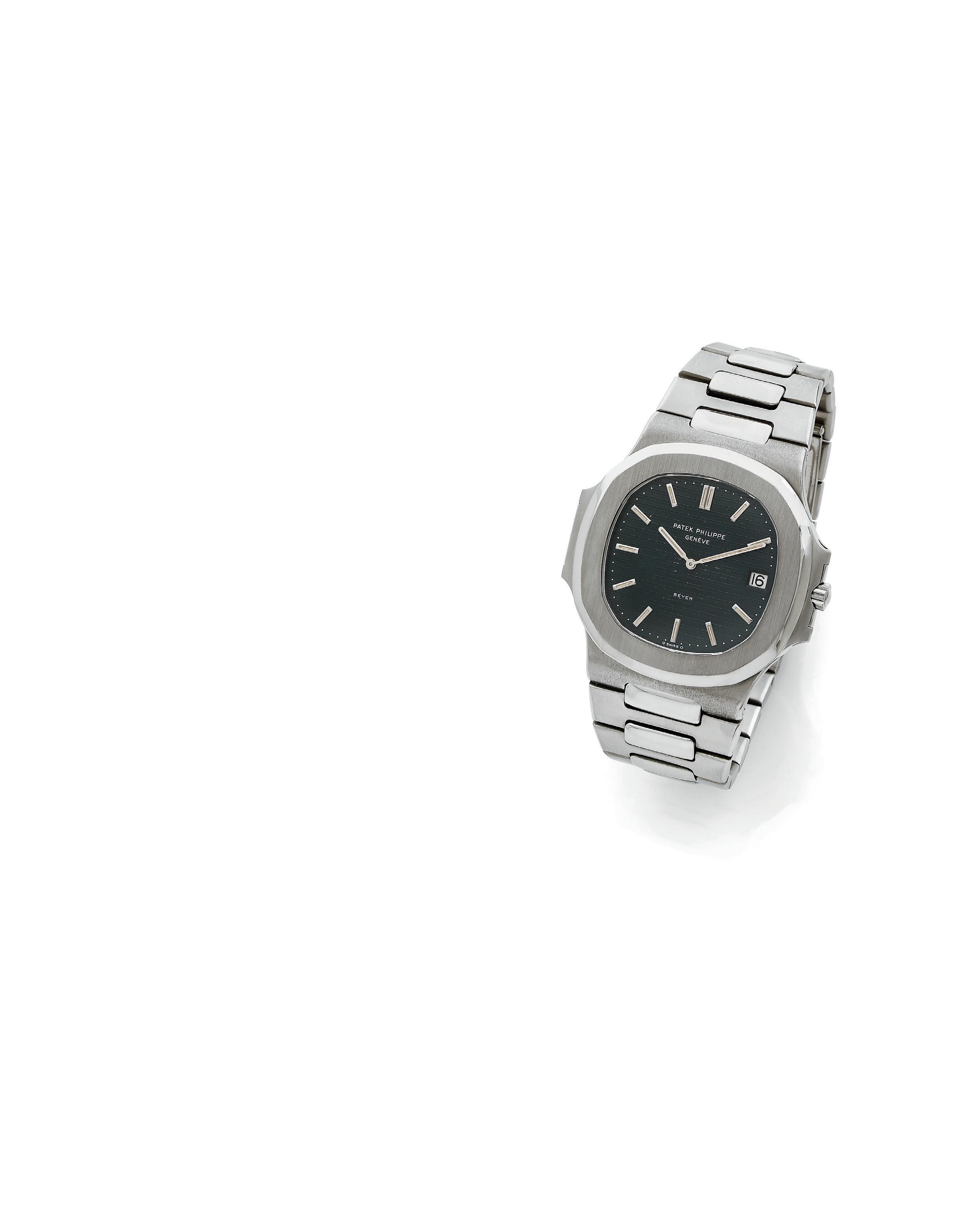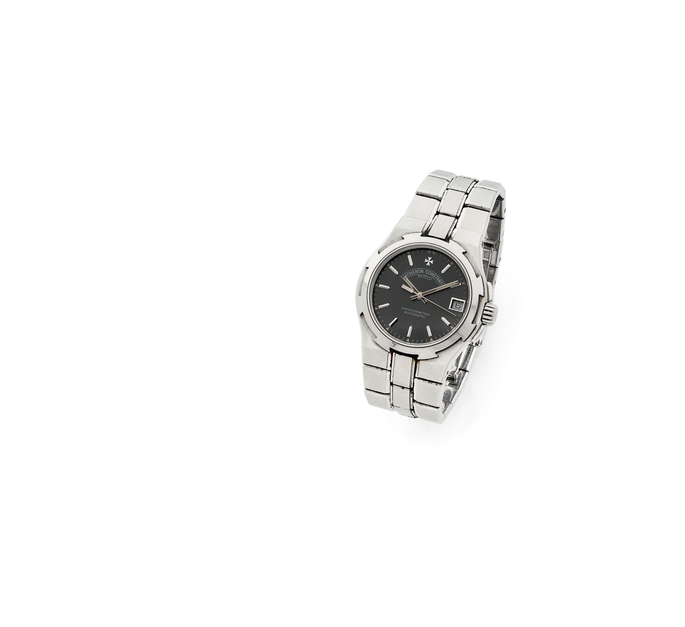 Cadran : argenté, index «bâton» appliqués, minuterie chemin de fer, trotteuse centrale, date à guichet, signé