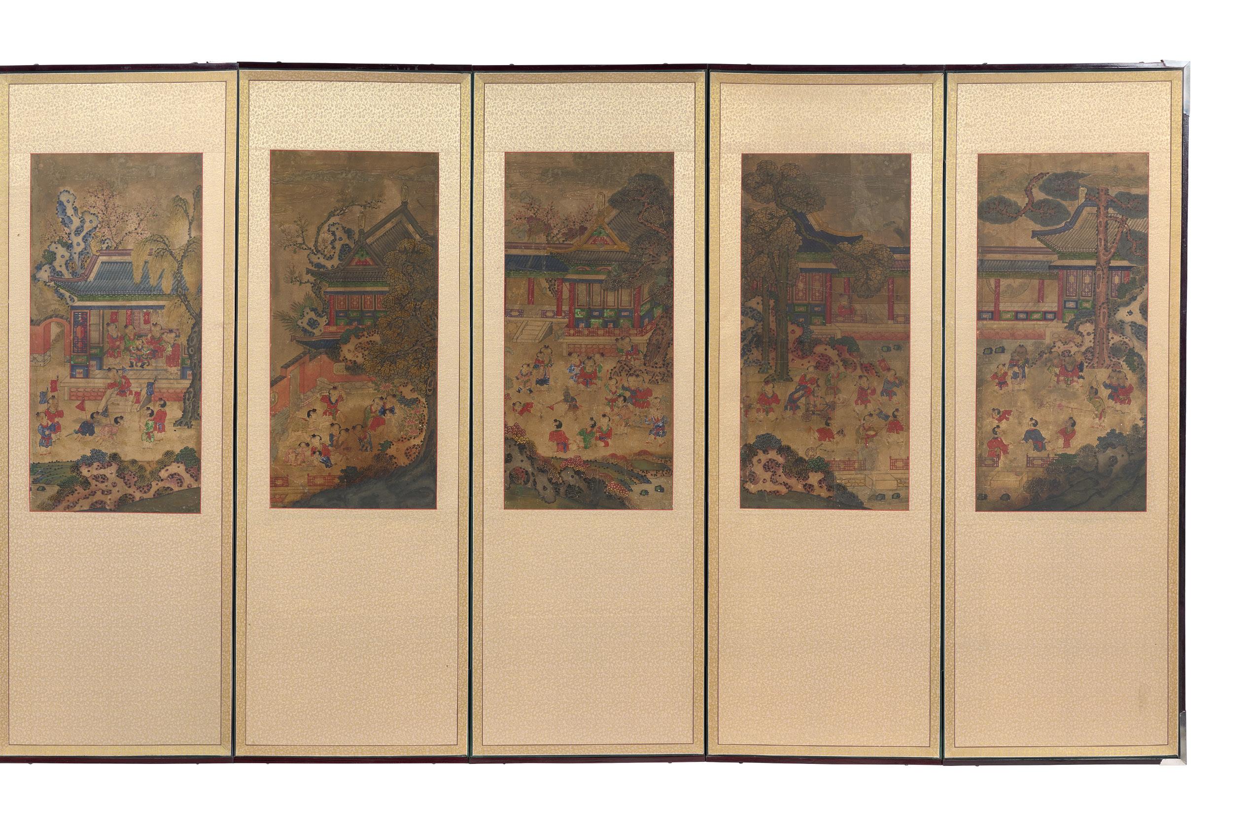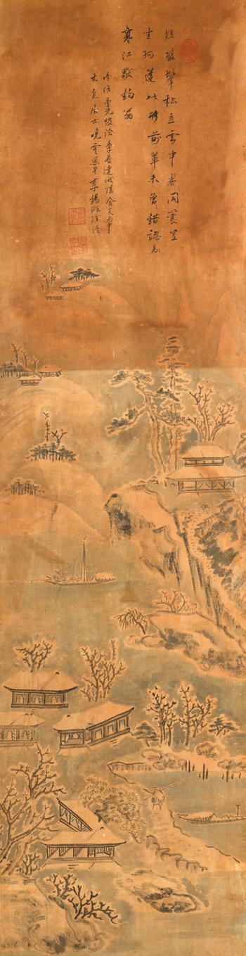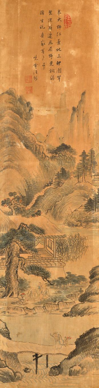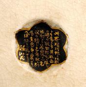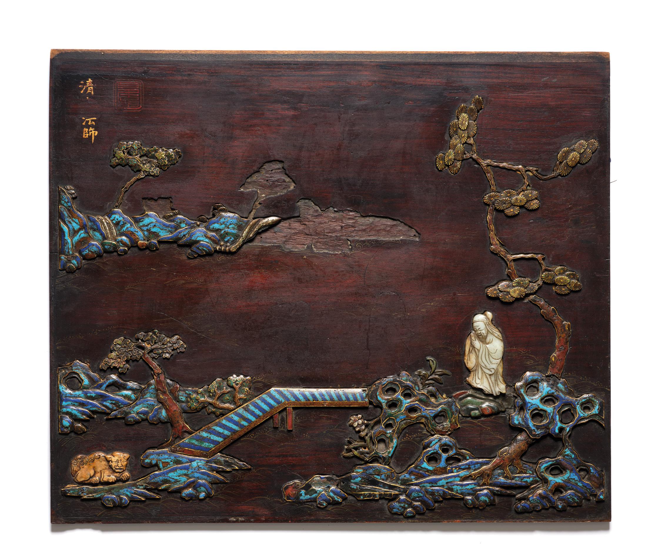 En forme de paravent, le dessus du couvercle à décor de pins et arbustes au bord d’une rivière qu’enjambe un pont, à l’intérieur, une coupelle ornée d’herbes et fleurs ; très légères restaurations