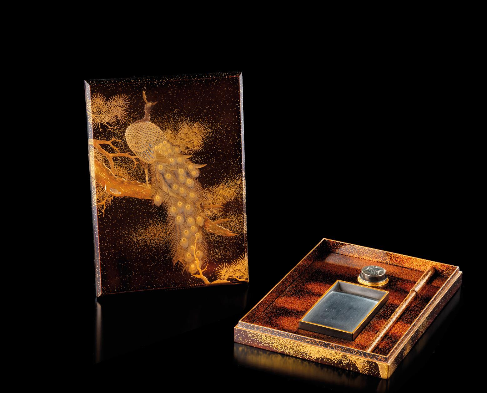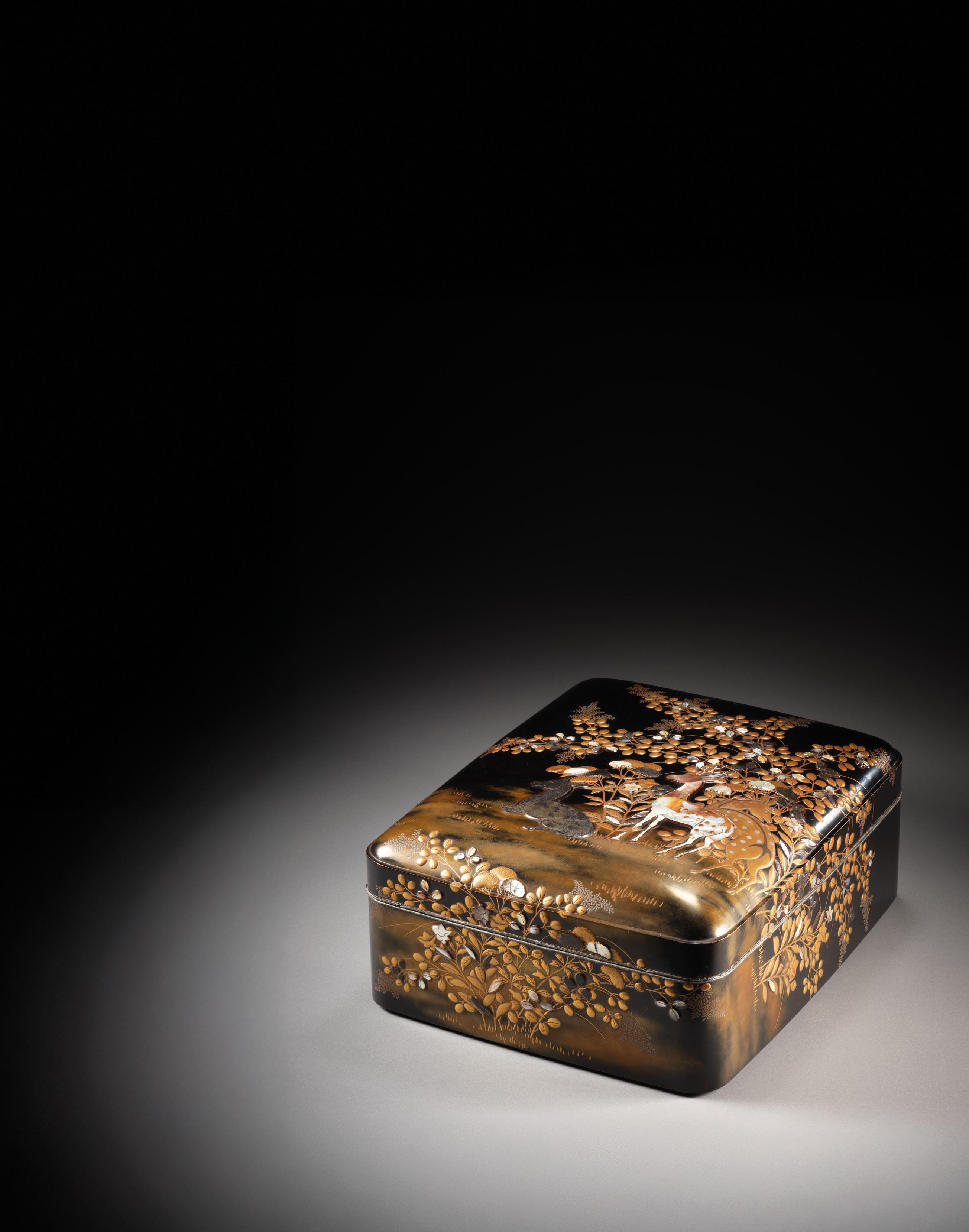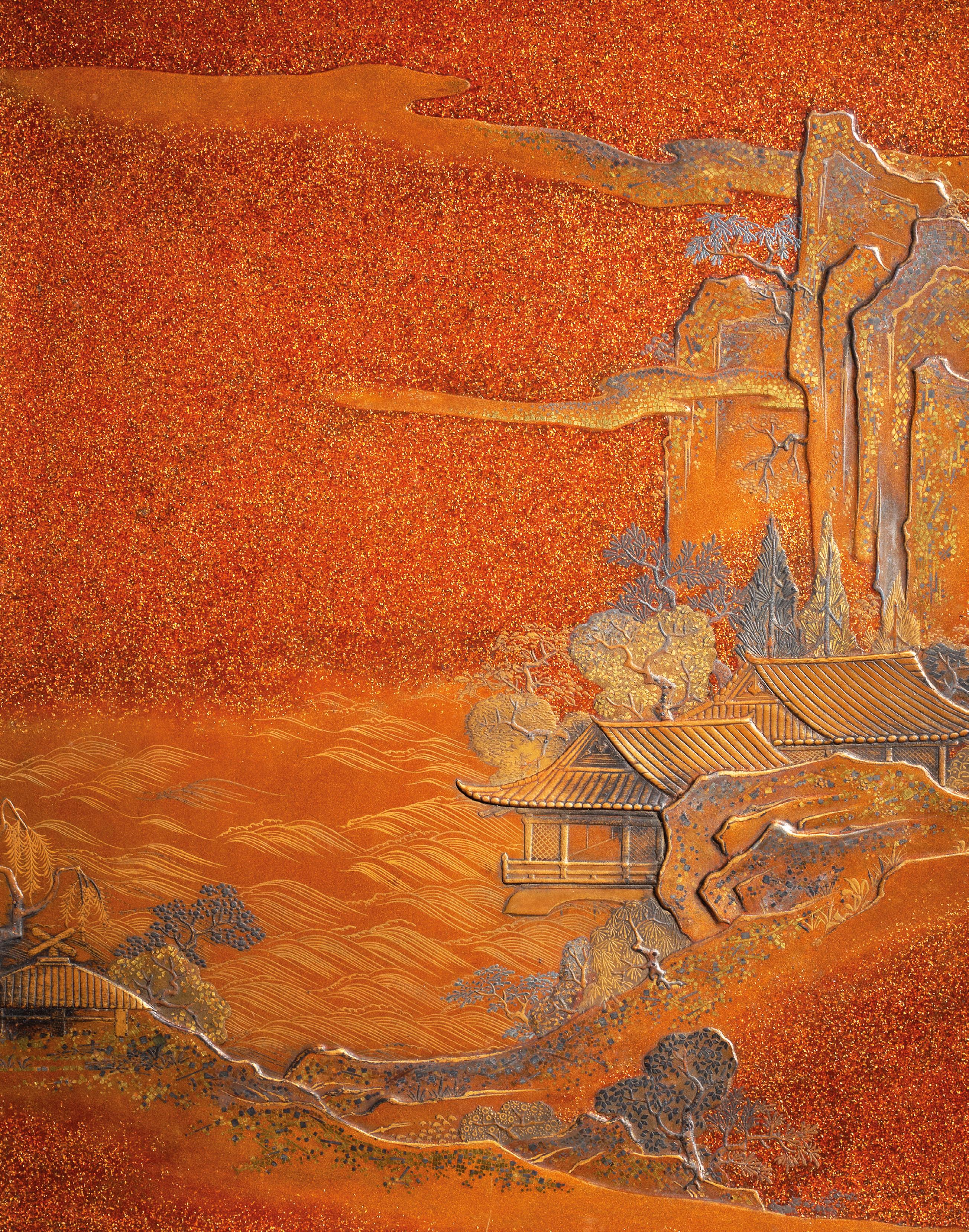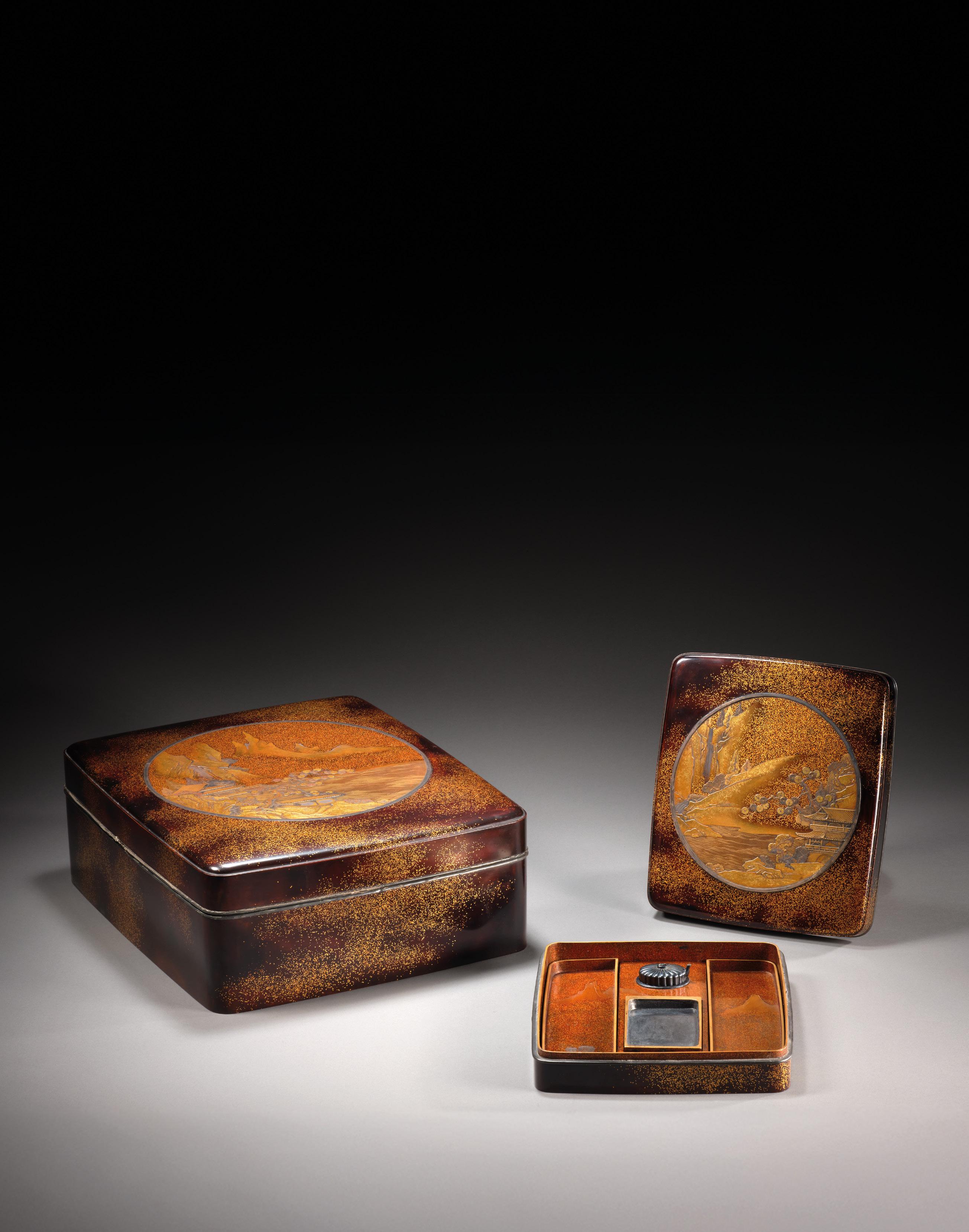 INCRUSTATIONS DE NACRE Japon, époque Edo (1603-1868) À décor en hiramaki-e et takamaki-e or, et incrustations de nacre, représentant des pavillons et chaumières au bord d’une rivière serpentant à travers un paysage montagneux et boisé