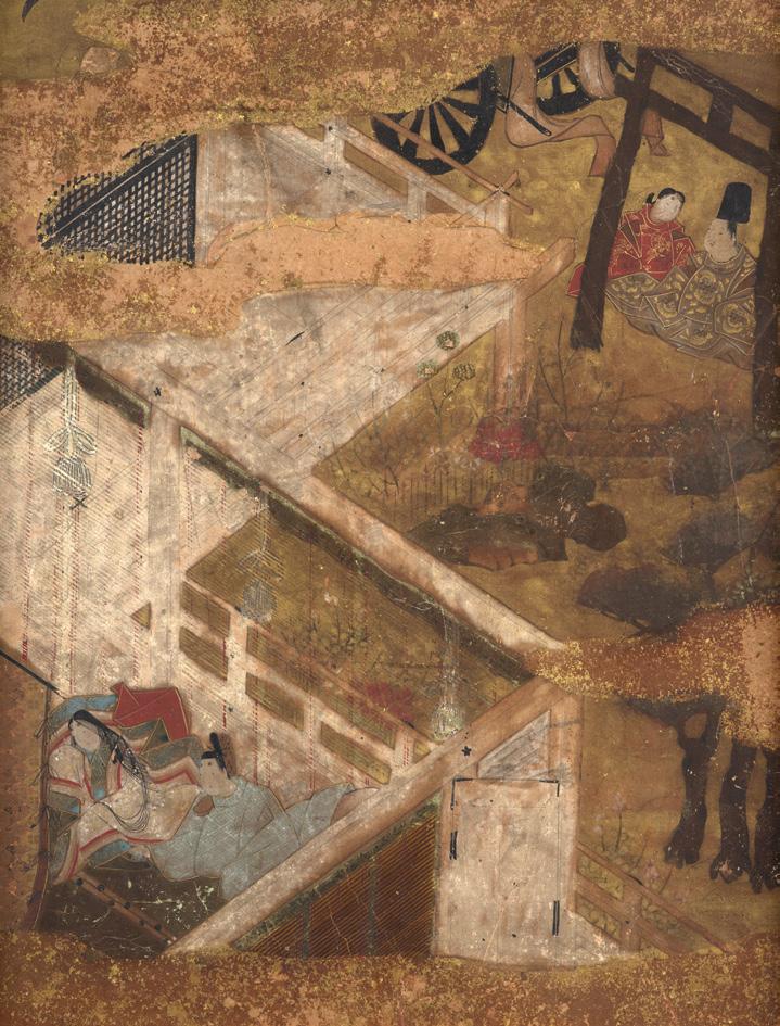 En forme d’éventail, le dessus du couvercle à décor en hiramaki-e et takamaki-e or d’un paysage montagneux, les côtés ornés d’une vue panoramique de pavillons dans un paysage montagneux et lacustre enjambé par un pont, l’intérieur du couvercle laqué d’un décor de troncs d’arbres et de poissons émergeant d’une eau ondoyante
