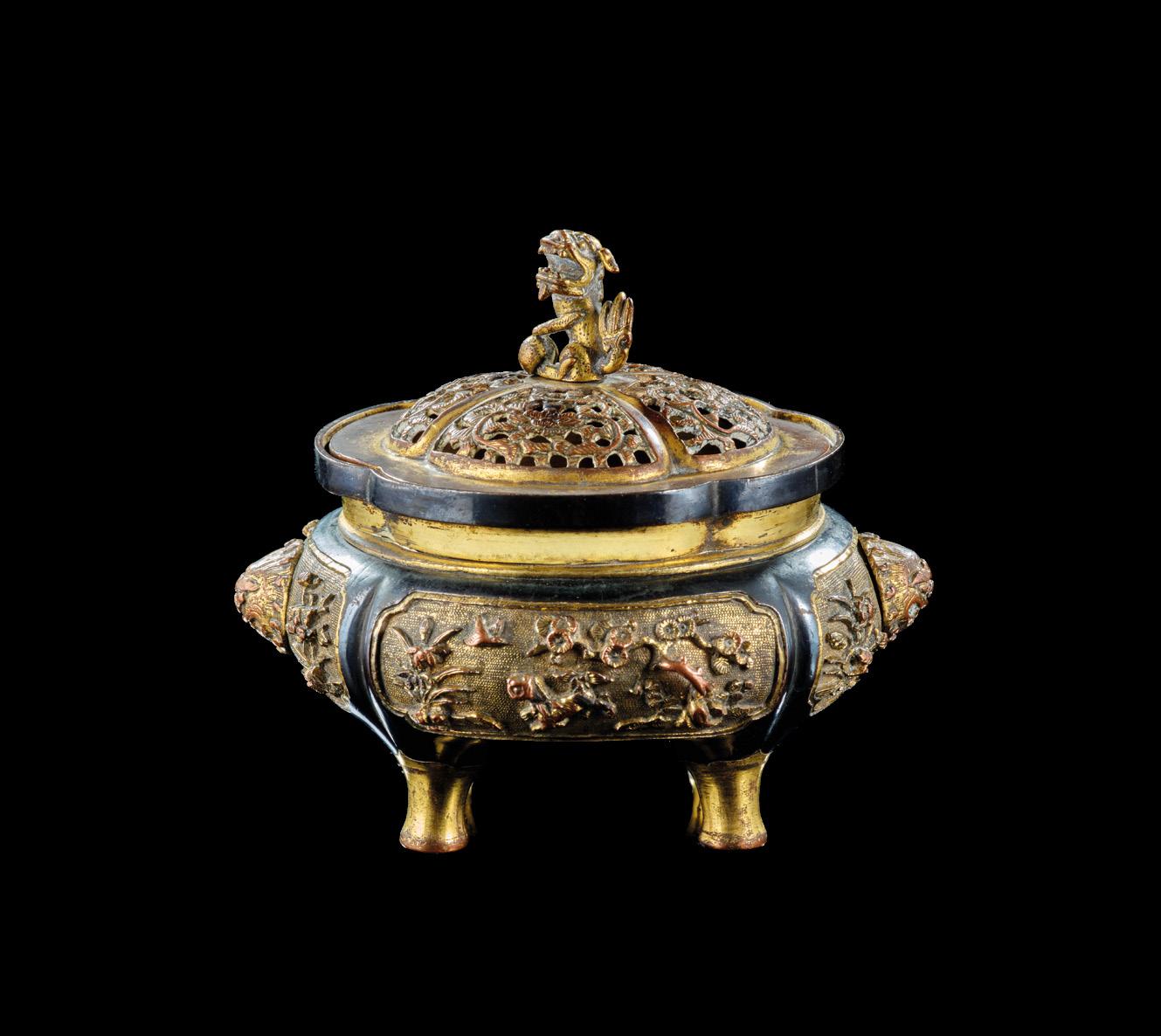 En forme de livre, à décor en hiramiki-e or, argent et rouge, de fleurs, rinceaux feuillagés et motifs de svastika, l’intérieur et le dessous nashiji or Dimensions : 1,2 × 8 × 7 cm (½ × 3 × 2 ¾ in.)