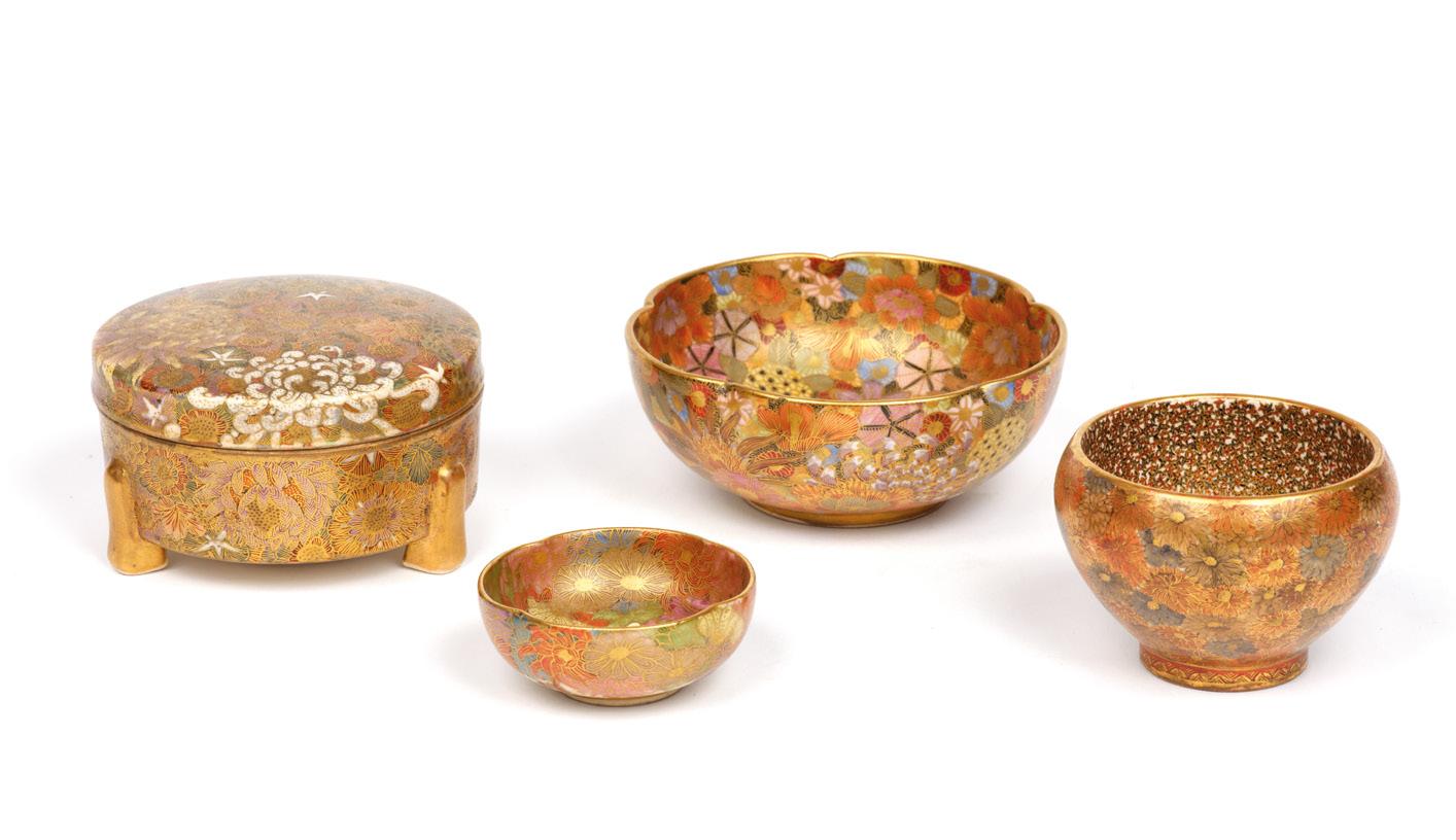 De forme quadrilobée, le dessus du couvercle à décor de pavillons dans un paysage montagneux et lacustre, à l’intérieur, une coupelle ornée d’asagao, l’intérieur nashiji or ; petits éclats