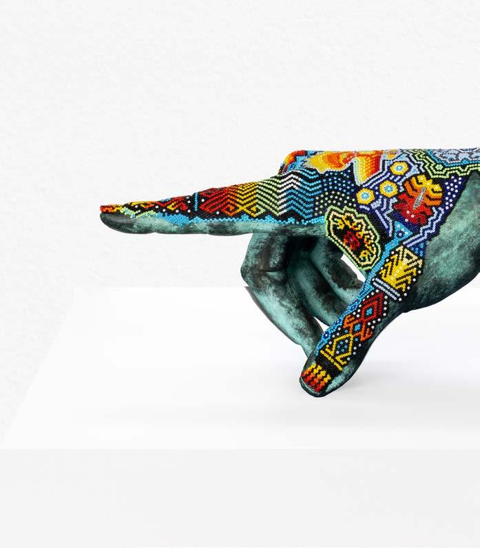 The most remarkable thing is that this artist relates elements as simple as confiscated knives and transforms them into music boxes, where the melodies of military marches of the great empires resound, drawing a parallel between great wars and battles waged by those who use this common utensil to survive. In this regard, Carlos comments: “Weapons are objects employed both to defend and attack, as well as to wage war at the highest level.” This statement also brings to light the cultural syncretism and the enthroned violence that we are surrounded by around the world. Therefore, he is very firm when he states “violence from one over another is a constant that also happens in nature, not just for humankind.” However, it is important to note that he does not force us to take any specific stance. Instead, he draws a historical and reflective itinerary where he appropriates certain symbols and gives them new meaning so others interpret and question them, or they assign them the load they deem adequate. His sculptures of Christopher Columbus and Isabella the Catholic that were intervened with plastic beadwork, a symbol of the Inga culture of Putumayo are an example of this. Carlos is very clear on one point: “We cannot think about these 500 years without Columbus. We grew with the intention to decolonize, but it is impossible to erase that past. These characters have moved all of us and we cannot forget, nor knock down, thins we cannot change. It is important people know this because history is cyclical.”