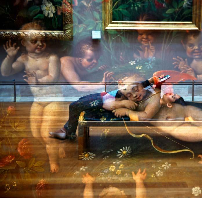 Ese recuerdo particular despertó el universo que hoy se refleja en sus fotografías, al igual que su visita al Rijksmuseum de Ámsterdam hace algunos años. Allí, observó cómo una multitud se congregaba frente a La ronda nocturna de Rembrandt, mientras que el resto de las obras del museo nacional de los Países Bajos pasaban desapercibidas para la mayoría de los espectadores. “Tuve la sensación de que los personajes de esas obras miraban a los visitantes y se sentían ignorados. Entonces, decidí fundirlos con el público desprevenido y cuando miré los resultados de la imagen combinada en el monitor de mi cámara, me interesaron las diferentes lecturas que proponía”, señala Andrés.