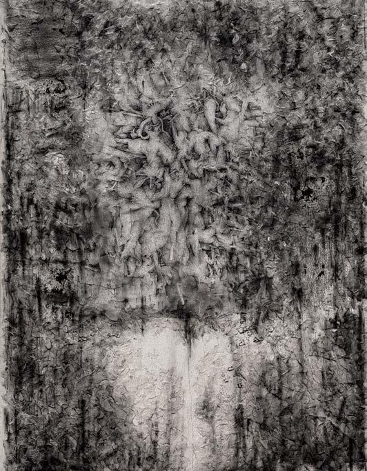 In Mientras respiro (As I Breathe, 2009-2019), ink and blurs become more subtle and slight; they almost seem as if they could fly away from the paper. Here, the artist explores an inner landscape, a memory holding the beauty of the fleetingness of life and its nature. In this group, she also includes the series Street Arts, with images that seem to clash with the previous. These show a territory with no landscape where the diamonic figurations of her initial imagery emerge as fragments and collages. Her 2022 and 2023 sculptures and resin artwork are also noteworthy and incarnate the blackness of her visual language.