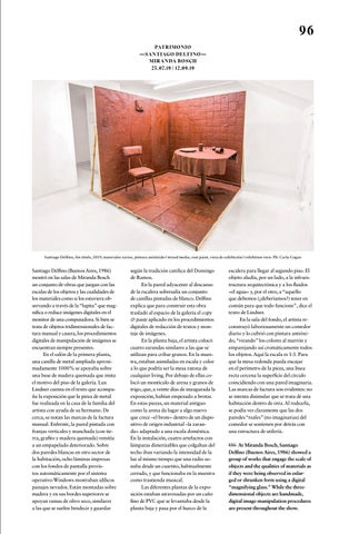 escalera para llegar al segundo piso. El objeto aludía, por un lado, a la infraestructura arquitectónica y a los fluidos −el agua− y, por el otro, a “aquello que debemos (¿deberíamos?) tener en común para que todo funcione”, dice el texto de Lindner. En la sala del fondo, el artista reconstruyó laboriosamente un comedor diario y lo cubrió con pintura antióxido, “virando” los colores al marrón y emparejando así cromáticamente todos los objetos. Aquí la escala es 1:1. Para que la mesa redonda pueda encajar en el perímetro de la pieza, una línea recta cercena la superficie del círculo coincidiendo con una pared imaginaria. Las marcas de factura son evidentes: no se intenta disimular que se trata de una habitación dentro de otra. Al rodearla, se podía ver claramente que las dos paredes “reales” (no imaginarias) del comedor se sostienen por detrás con una estructura de utilería. At Miranda Bosch, Santiago Delfino (Buenos Aires, 1986) showed a group of works that engage the scale of objects and the qualities of materials as if they were being observed in enlarged or shrunken form using a digital “magnifying glass.” While the threedimensional objects are handmade, digital image-manipulation procedures are present throughout the show. ENG