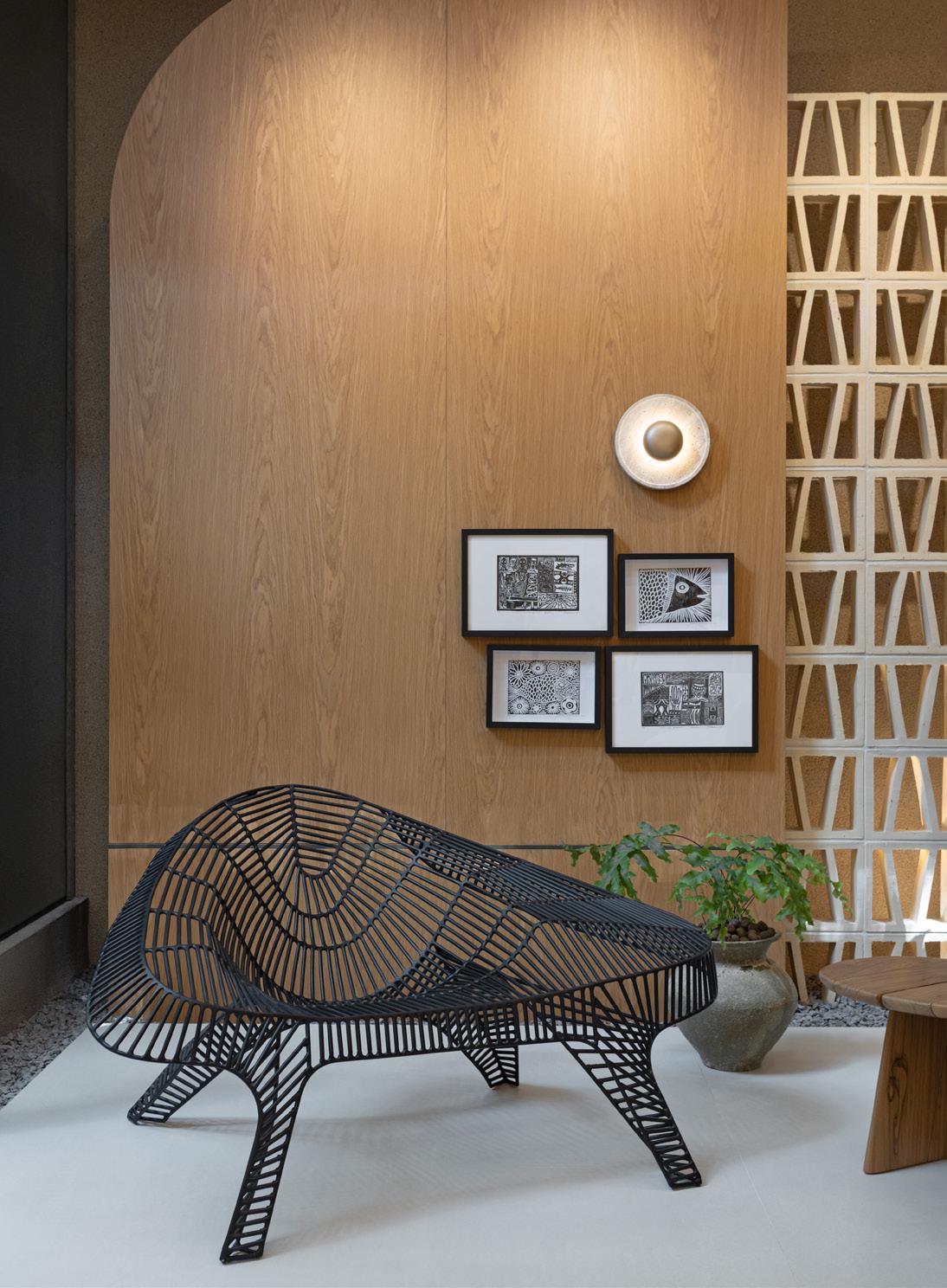 Com mais de duas décadas de parceria profissional, as arquitetas Theka Mendes e Renata Scherer trazem a arte popular brasileira ao centro das atenções, destacando especialmente a xilogravura como referência principal. Essa escolha inspira a paleta cromática, texturas e elementos decorativos cuidadosamente integrados no ambiente – a poltrona Calisto, da Beach & Country, emerge como peça-chave e ponto focal do espaço, promovendo acolhimento e equilíbrio visual. Cada elemento selecionado pelas arquitetas é projetado para transmitir sensações positivas e uma conexão emocional profunda com a cultura brasileira, desde a iluminação estrategicamente planejada que complementa a atmosfera acolhedora e cria uma experiência sensorial única até a seleção das obras de arte e acessórios.