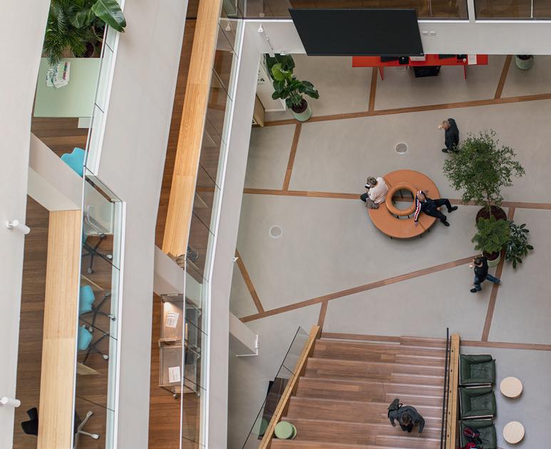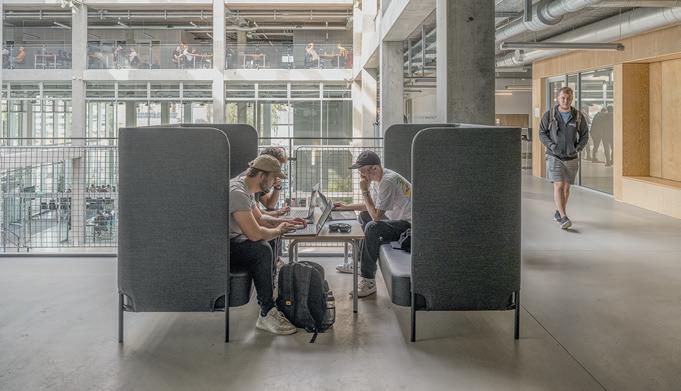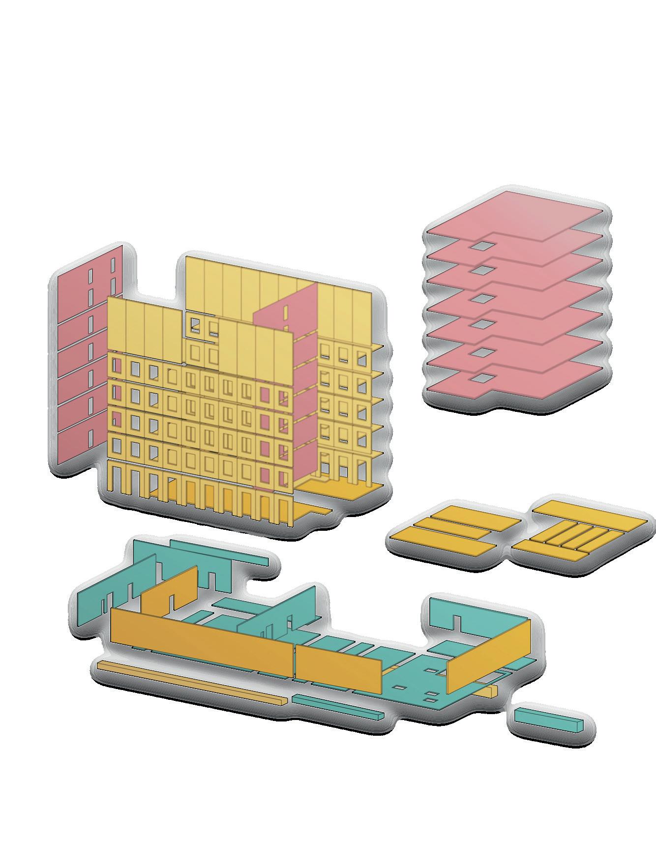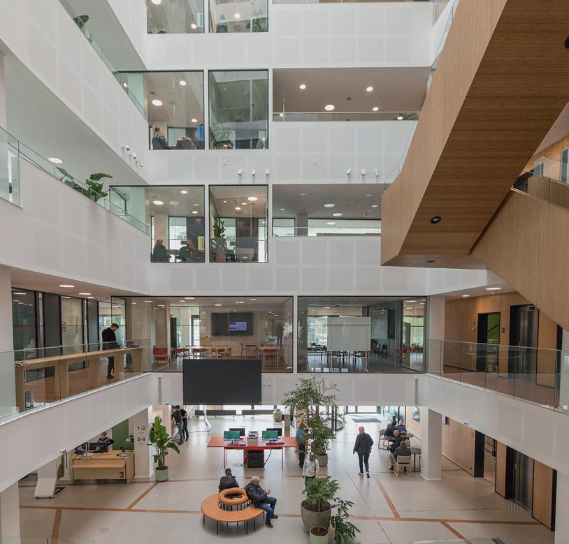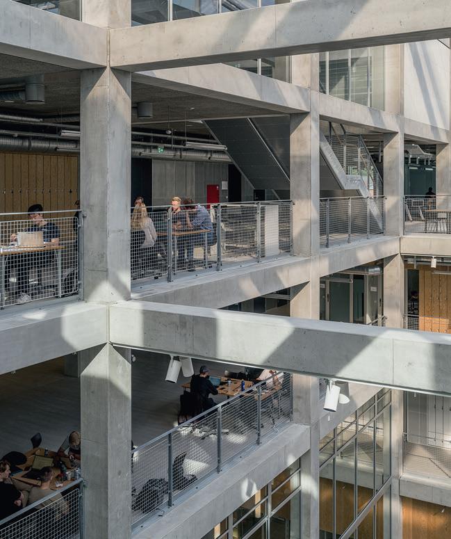 Byggeriet består primært af regelmæssige moduler, men flere steder er der indtænkt dobbelthøje rum, der skaber visuel afveksling i bygningens design og rummer de funktioner i huset, der kræver højt til loftet. De dobbelthøje rum forskyder sig rundt i byggeriet for hver etage, så ingen af etagerne er helt ens, hvilket også har stillet ekstraordinære krav til vores beregninger, forklarer Sidsel :