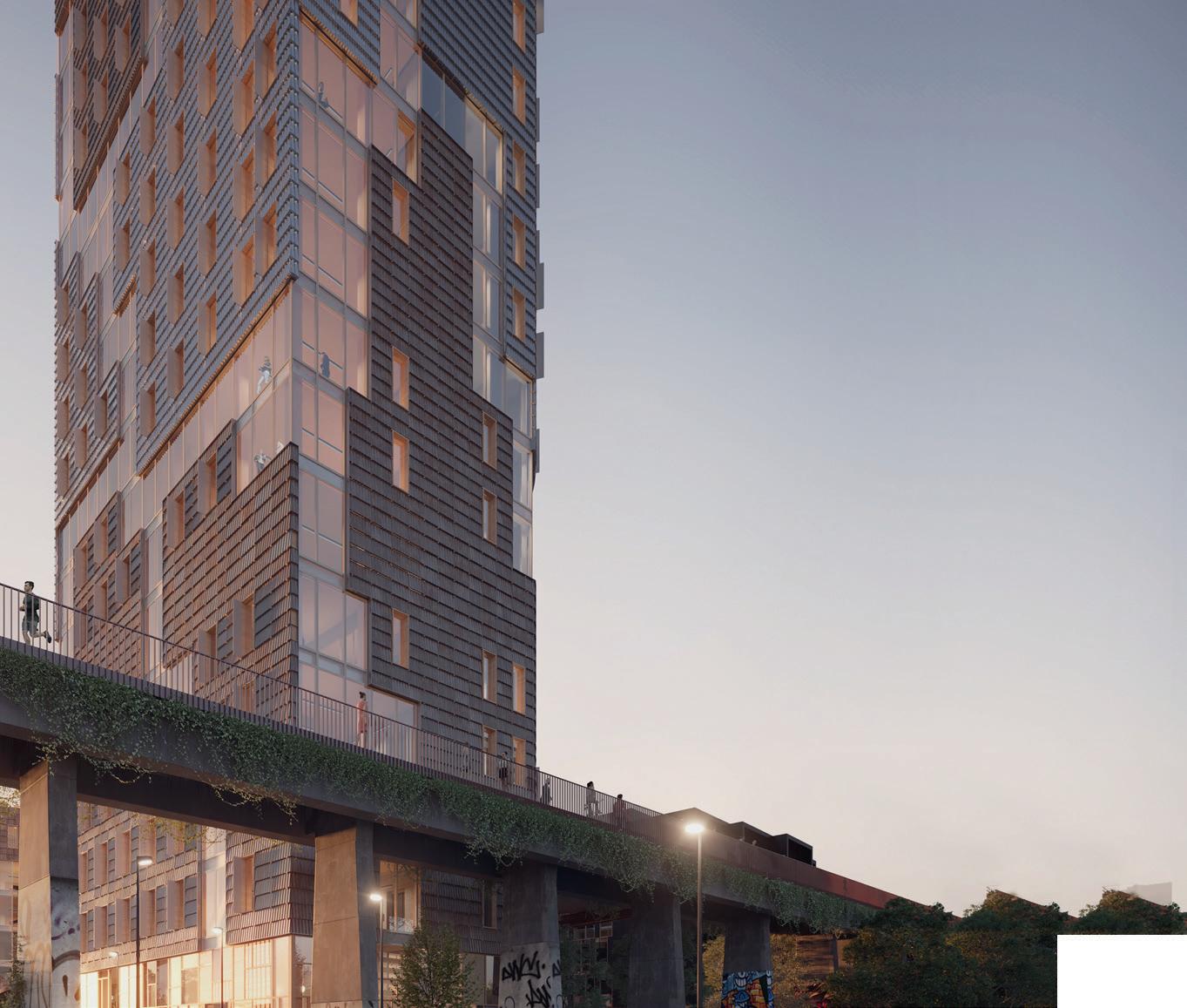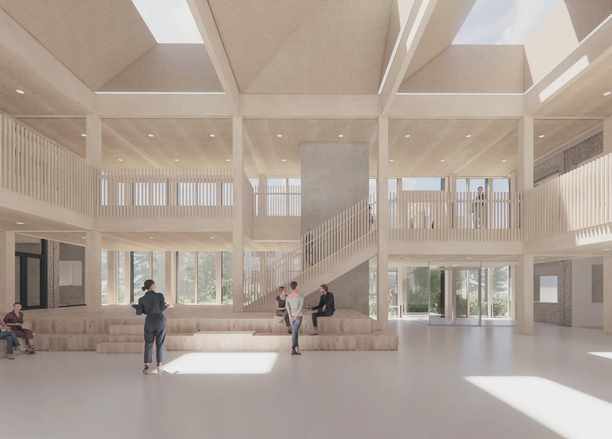 20-etagers kontorbyggeri i træ og genbrugsmaterialer.