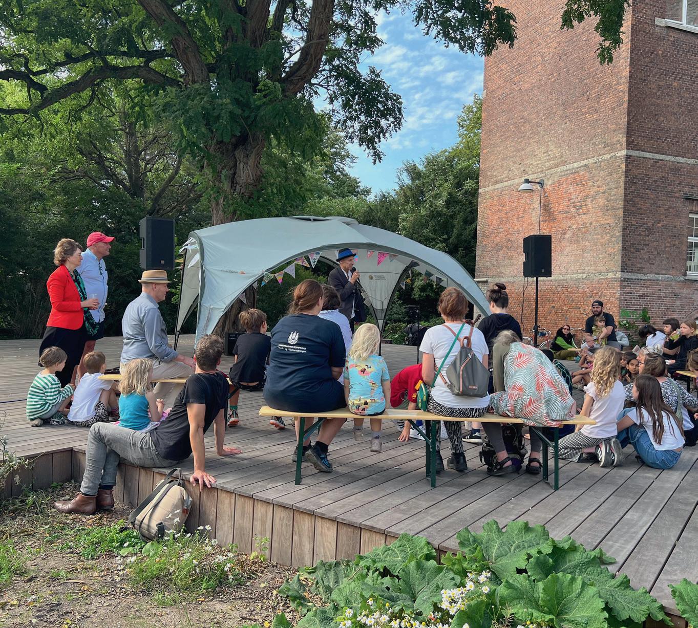 certificerede trætyper og genanvendt materialer – herunder legeredskaber og unikke elementer som totempæle lavet af udsatte voksne.