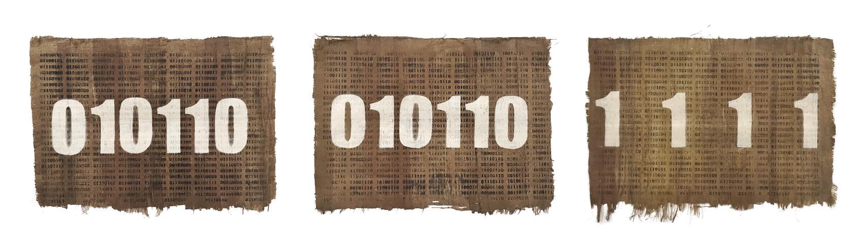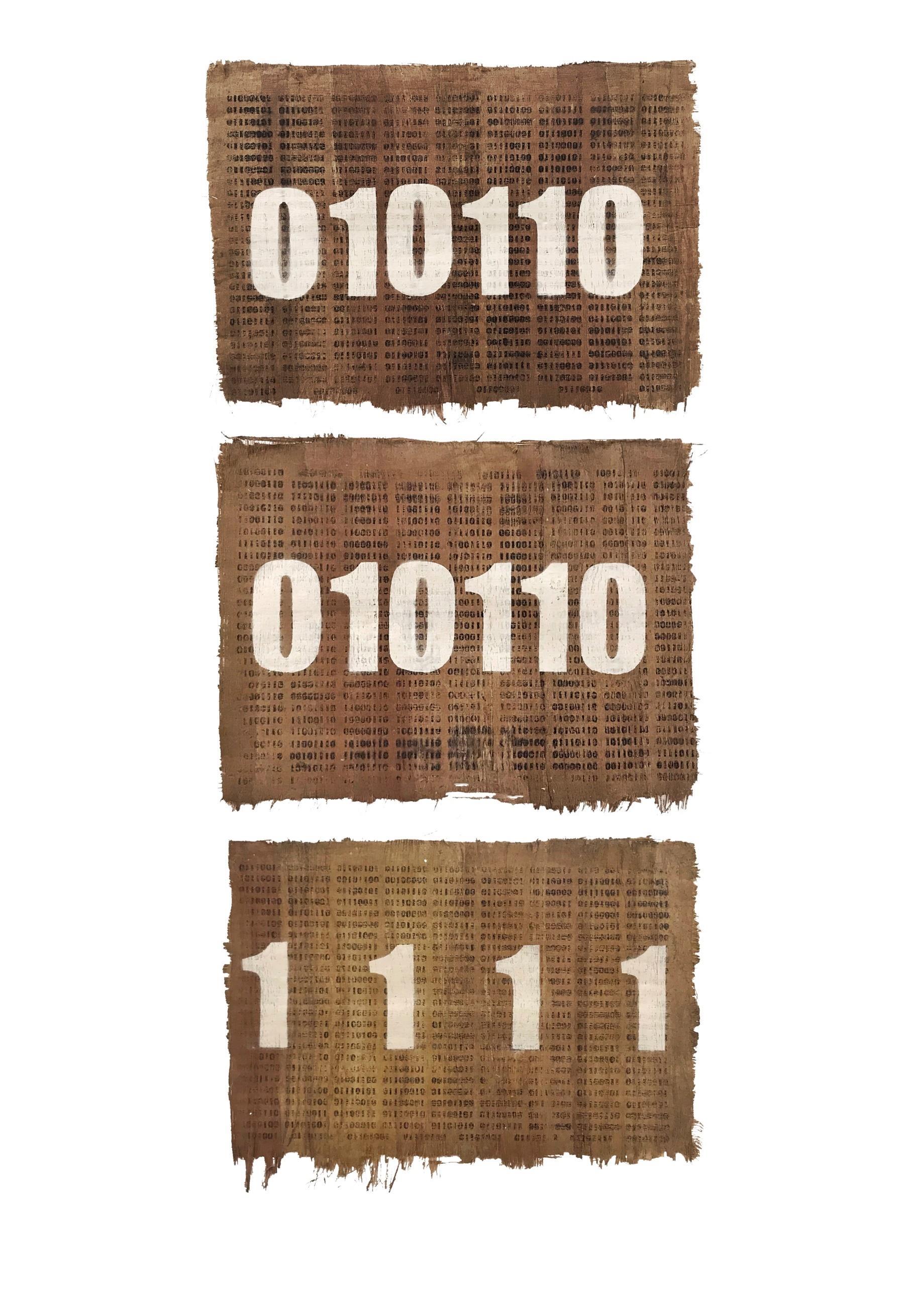 Autorretrato es una obra realizada en tres partes que se unen, cuyo fin es plantear el uso del sistema binario, aquel código numérico representado únicamente mediante las cifras cero y uno, en un soporte utilizado por las civilizaciones pasadas: el papiro (Fig. 5). Por lo tanto, constituye un elemento visual que interpela a los receptores mediante la coexistencia de materiales opuestos: el papiro, de origen vegetal, versus la pintura en spray, de origen plástico, tomando como ejemplo las escrituras egipcias expuestas en distintos museos del continente europeo (con la finalidad de asemejar un registro histórico de antaño), en contraste con la escritura binaria, que permite el funcionamiento y procesamiento de la información en los ordenadores, siendo el sistema utilizado por los medios digitales de la actualidad.