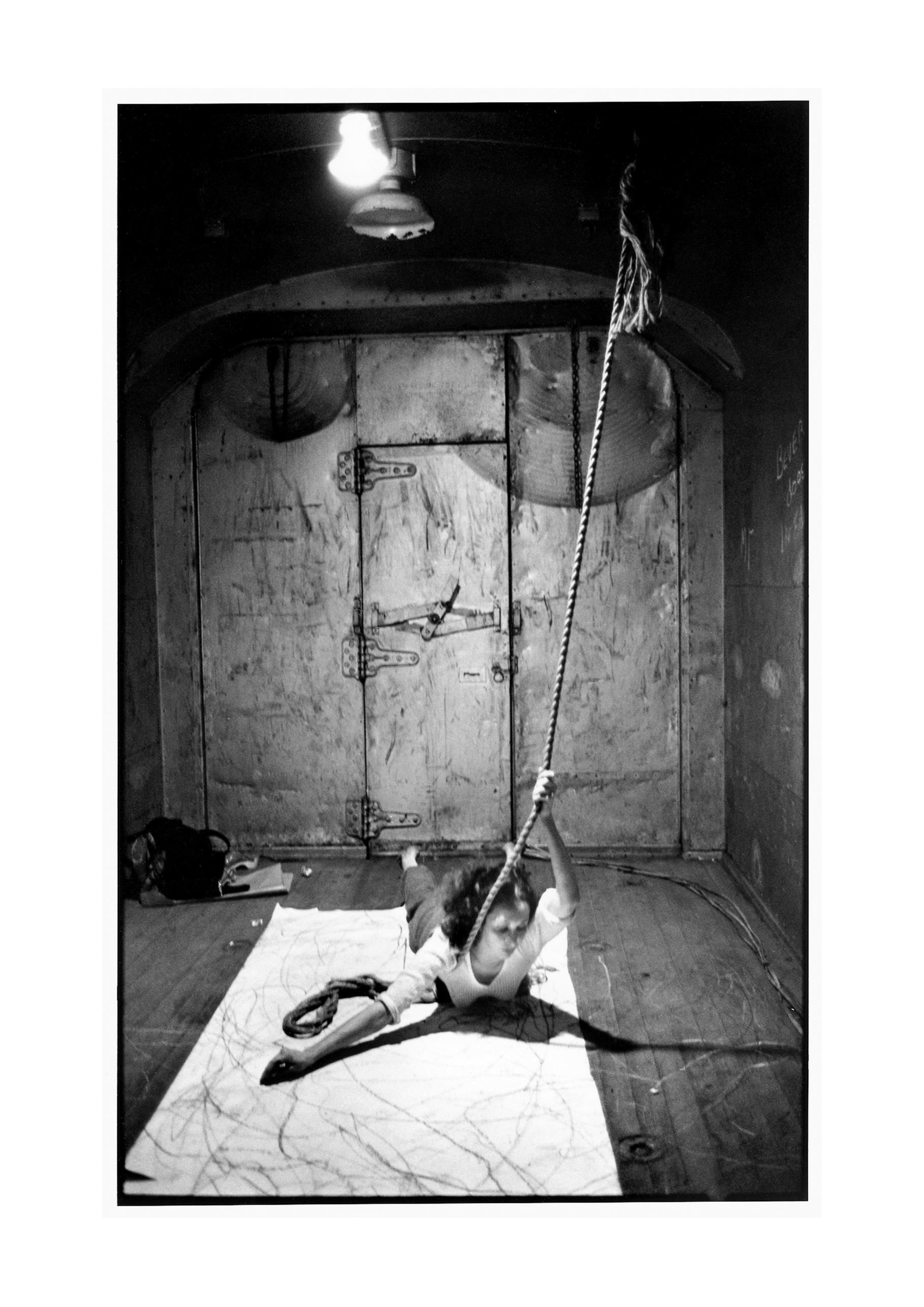 Fig. 42 Carolee Schneemann performance Tracking, 1973. ©2013 Artist Rights Society (ARS) New York. Fotografía: Peter Moore ©2013 Estate of Peter Moore/VAGA, NYC. [consulta: 22 de septiembre]. Disponible en: http://walkerart.org/collections/publications/performativity/drawings-of-trisha-brown/