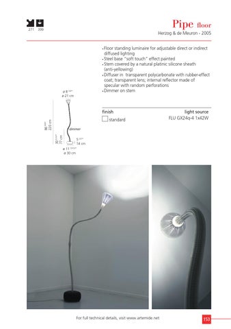 Herzog & de Meuron - 2005 Floor standing luminaire for adjustable direct or indirect diffused lighting • Steel base “soft touch” effect painted • Stem covered by a natural platinic silicone sheath (anti-yellowing) • Diffuser in transparent polycarbonate with rubber-effect coat; transparent lens; internal reflector made of specular with random perforations • Dimmer on stem •