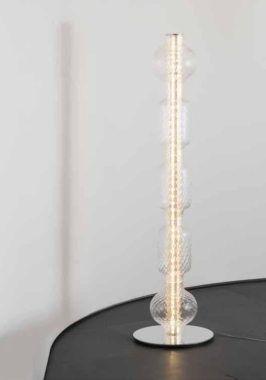 The special processing of the glass, hand-crafted at the Artemide glass factory, ensures that each lamp is a unique piece. It represents a modern take on the traditional Venetian technique called “balloton”. Through a dual processing technique, small squarebased pyramids are first impressed into the hot glass. In a subsequent phase, the piece is given its final shape. The hand-blown technique turns the volumes into a three-dimensional texture that comes alive with the interplay of light.