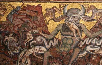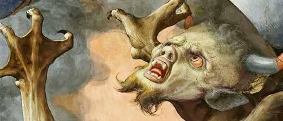 quelle bacchiche, come satiri, sileni e l’immancabile Pan. In ritardo, tuttavia, rispetto alle discettazioni dei filosofi cristiani, dei Padri della Chiesa arrivano le immagini. Iniziano a presentarsi più numerose e incalzanti in epoca carolingia, per esecrare i Longobardi. Prima avvisaglia, dunque, di demonizzazione del nemico. Poi, è con il Romanico e il Gotico che le cattedrali si popolano di figure demoniache. Satana si trasforma nei secoli. Diventa di colore livido, può avere le classiche corna o le ali di pipistrello; giganteggia in Giudizi universali, prima della nascita di Dante, influenzando il Sommo Poeta, poi per essere influenzato da lui. Si tratta di un mostro, a volte a tre teste, contor-