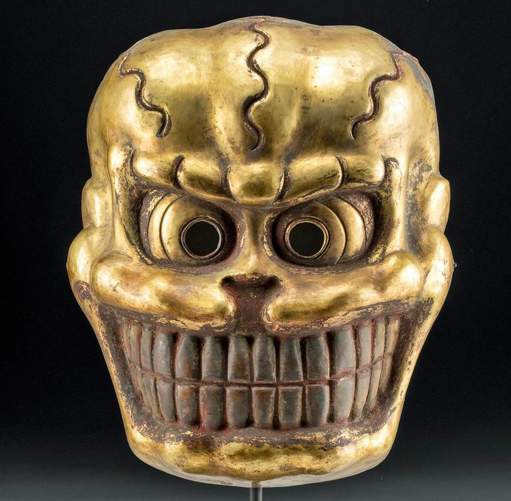 Gilt copper dance mask of a Citipati, a skeletal protector deity in Himalayan Buddhism. 9.25” W x 11.5” H. gold quality: 10%. Est. $2,800-$4,200