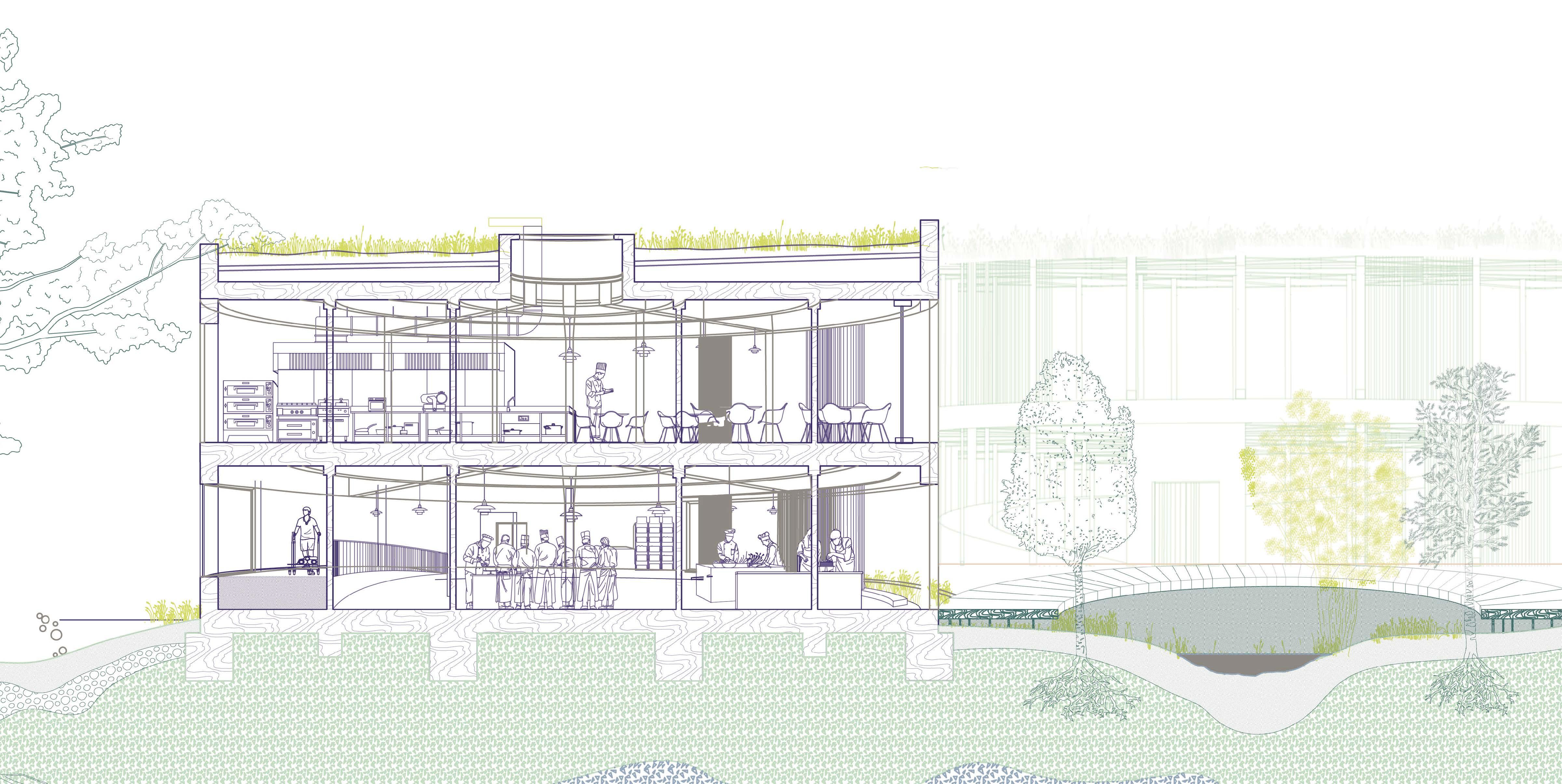 Easy access to the outdoors is a key component to elderly care, which is why the top floor of the apartment is dedicated to outdoor event space, also able to be accessed by the public.