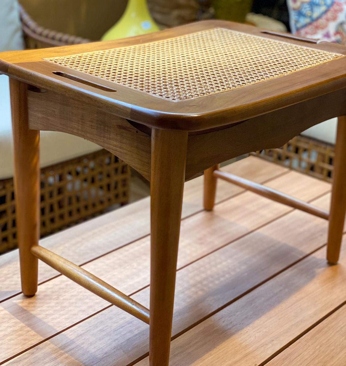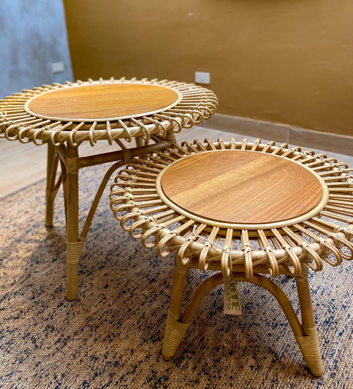 De mimbre y ratán con tope natural de madera roble de Brazil.