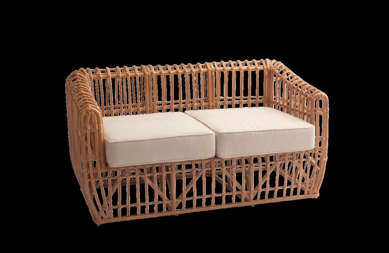 modelo “Global” Elaborado en madera de jequitibá. Butaca modelo “Terra” Elaborada en mimbre. Ottoman modelo “Barcom” Tejida en ratán y soga natural.