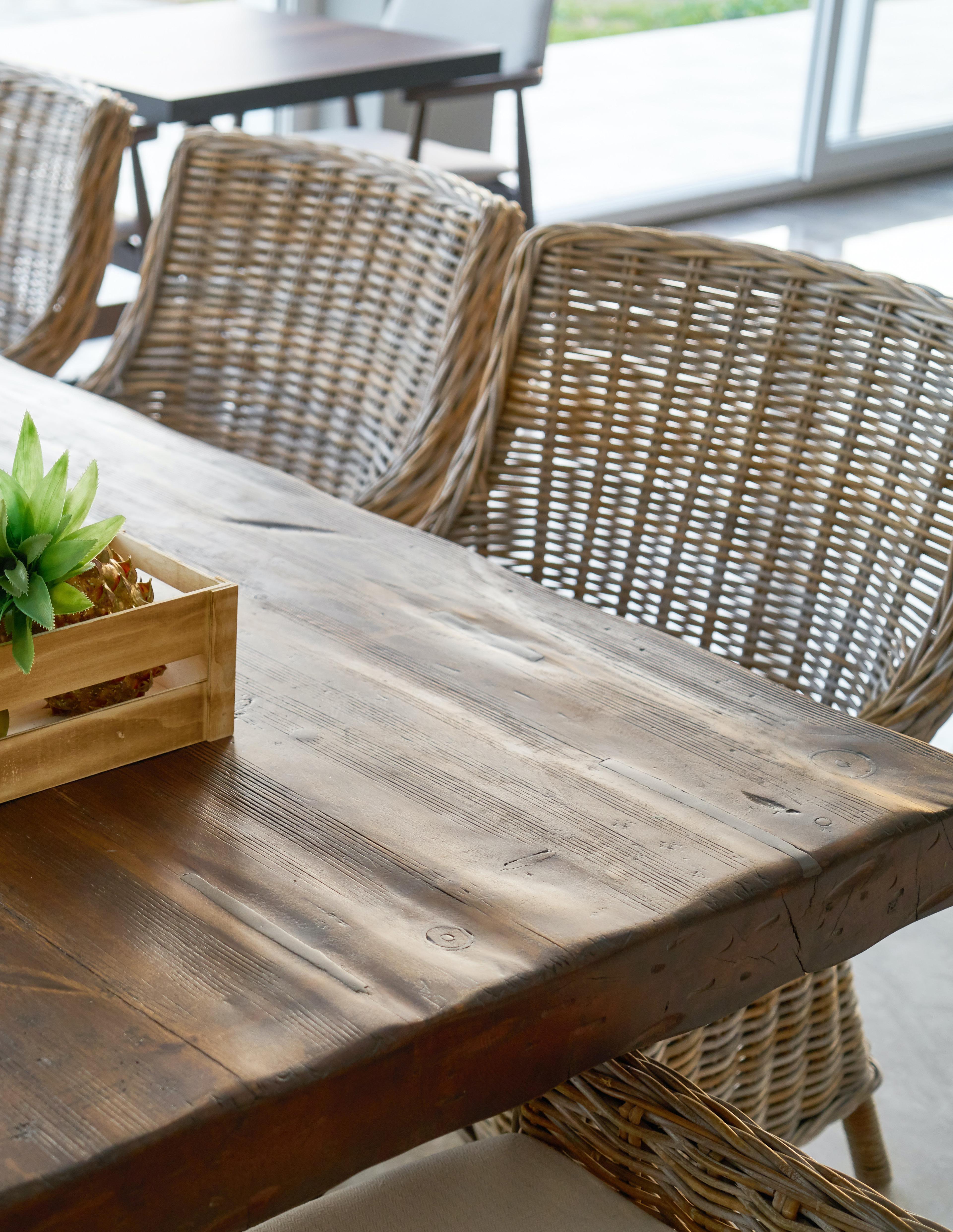 18 | ARTE NATIVO Haragana modelo “Aquarium” Silla modelo “África” Elaborada en ratán y pajilla. Sillas modelo “Don Ramón” Con asiento tejido en guano y base pintada en deep blue. Banco de dos modelo “Aquarium”