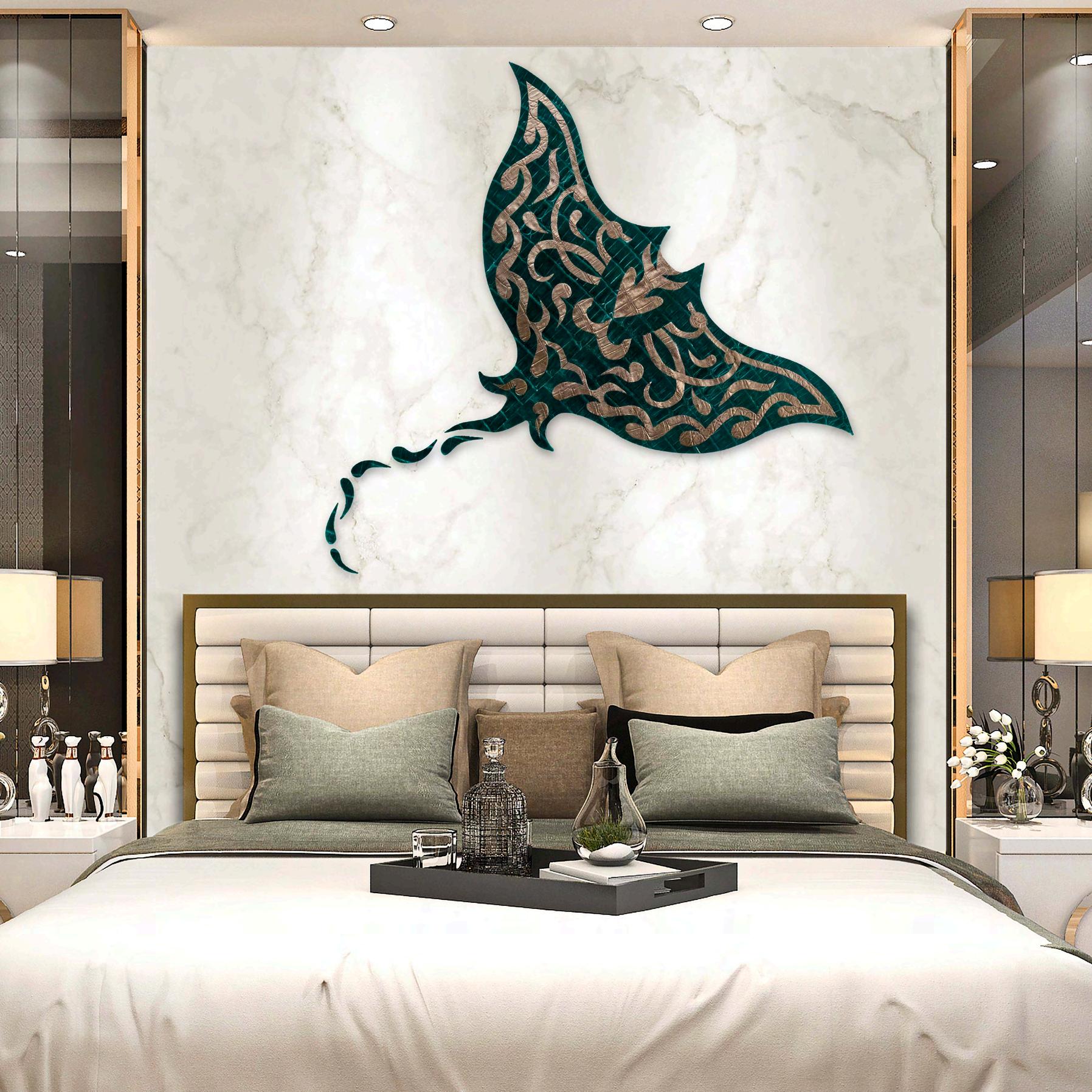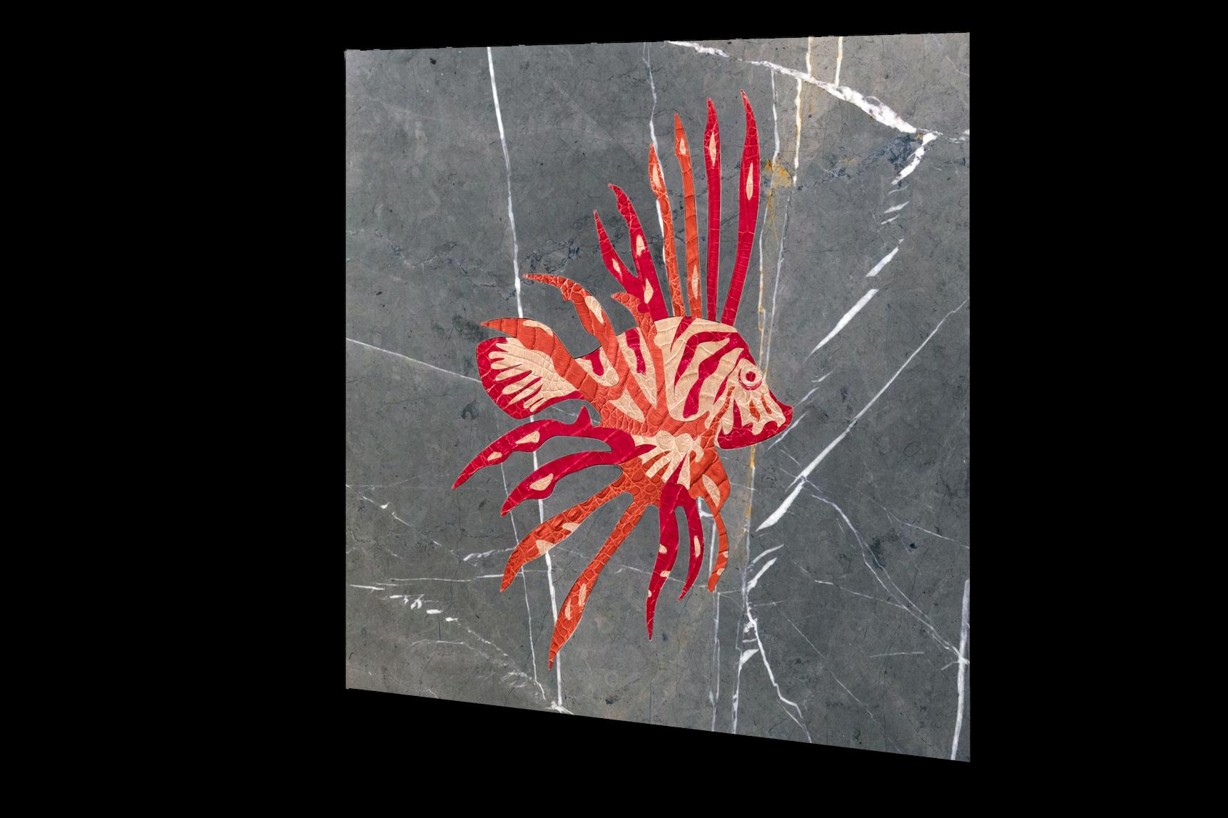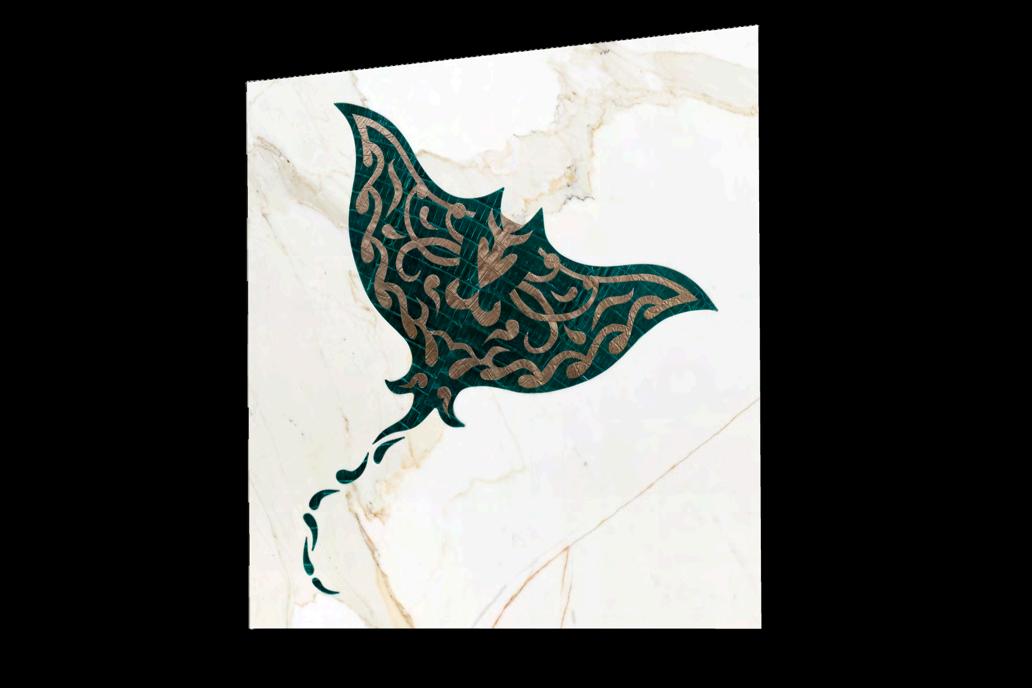 These evocative decorative panels surprise with the originality of their subjects.OnabaseofpreciousNeroMarquiniamarble,astylizedlionfishis depicted and entirely crafted using precious caiman leather with a glossy finish in three different colorations. The same approach is used for the mantarayonaCalacattagoldmarblebase.