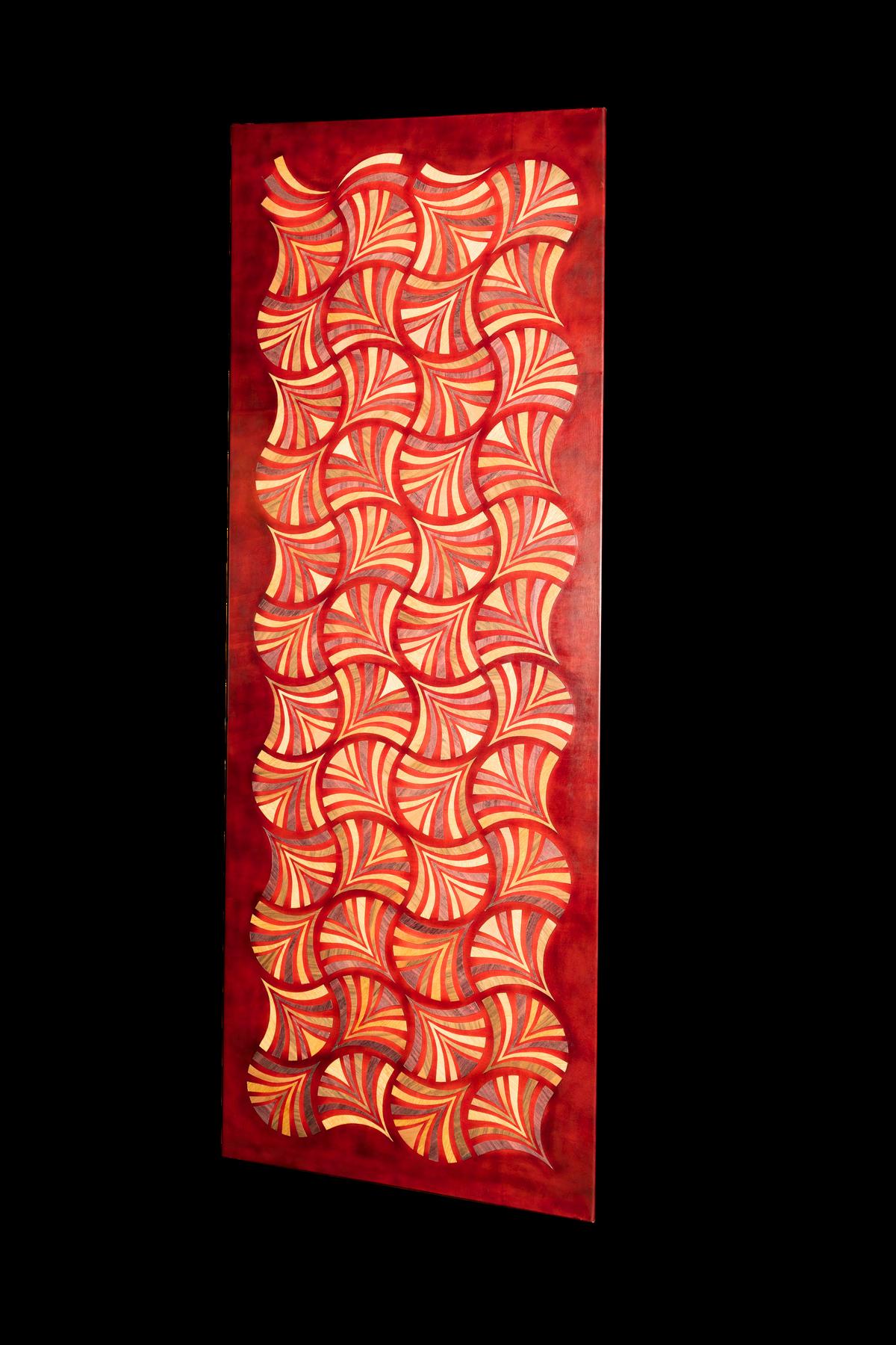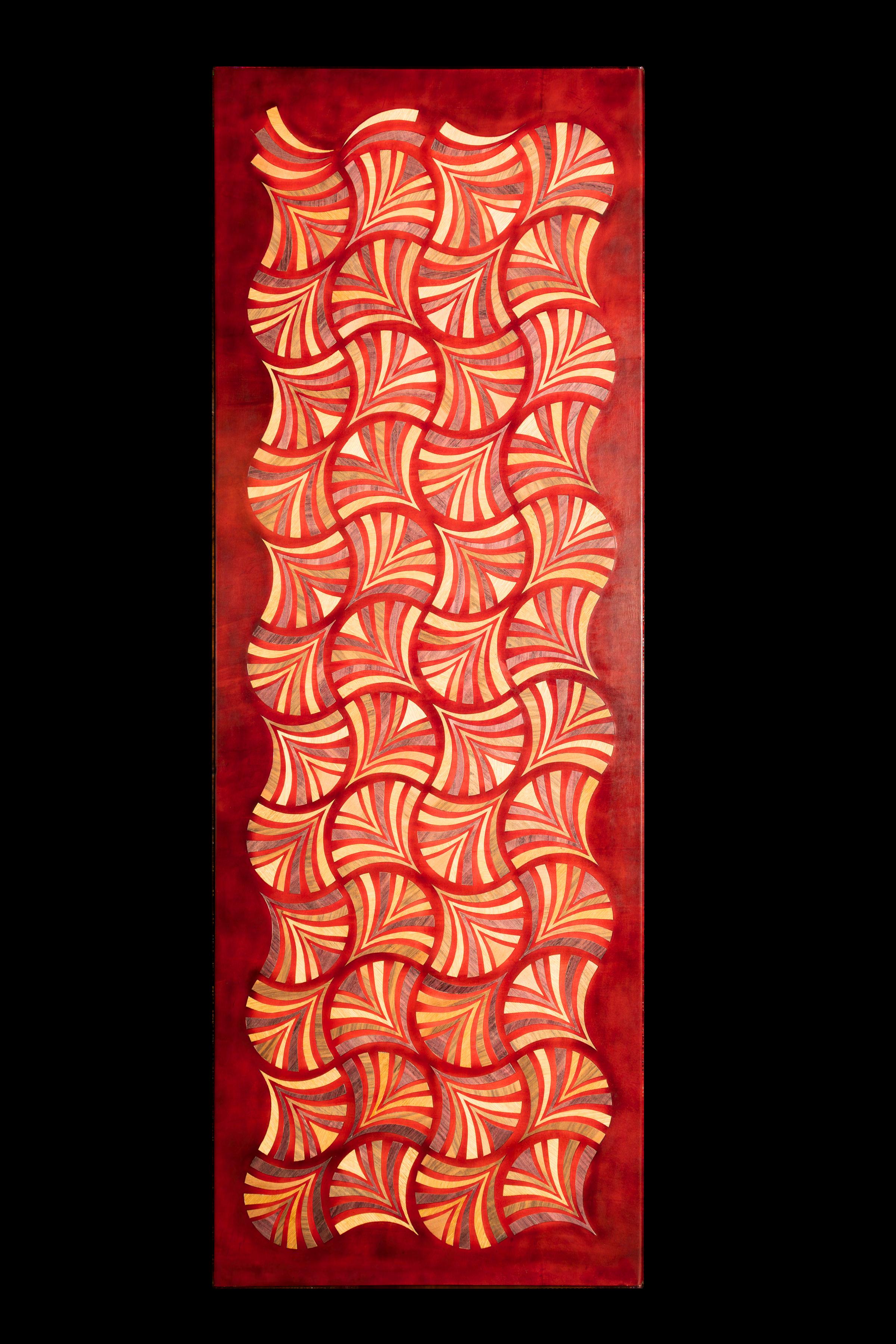 This refined decorative panel represents a contemporary interpretation of the art of inlay, where Italian craftsmanship merges with Eastern aesthetic influencesinasymphonyofpreciousmaterials.Thepieceisdistinguishedby the masterful use of fine woods and rare essences, each selected not only for its aesthetic qualities but also for its unique texture and grain, which contribute to the overall composition. These wooden elements intertwine harmoniously with sections of natural crust leather, creating a material dialogueofextraordinarysophistication.