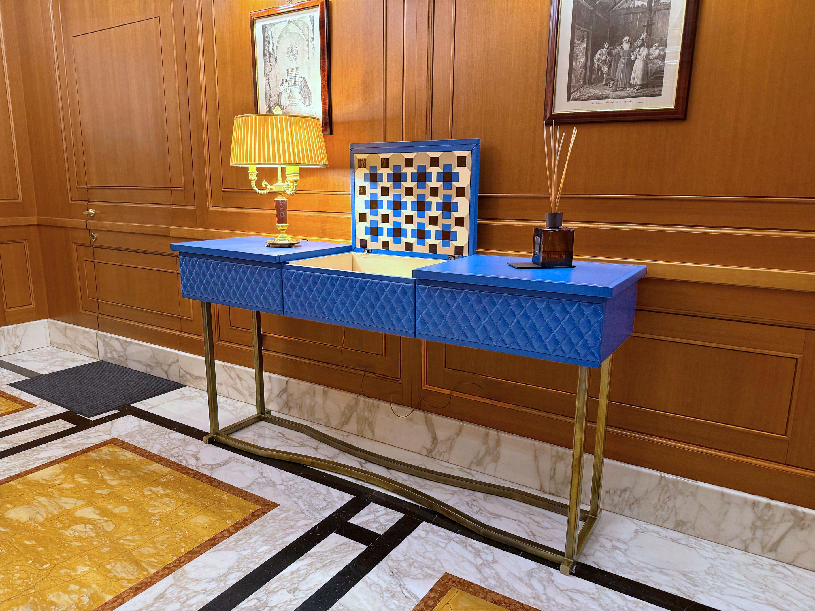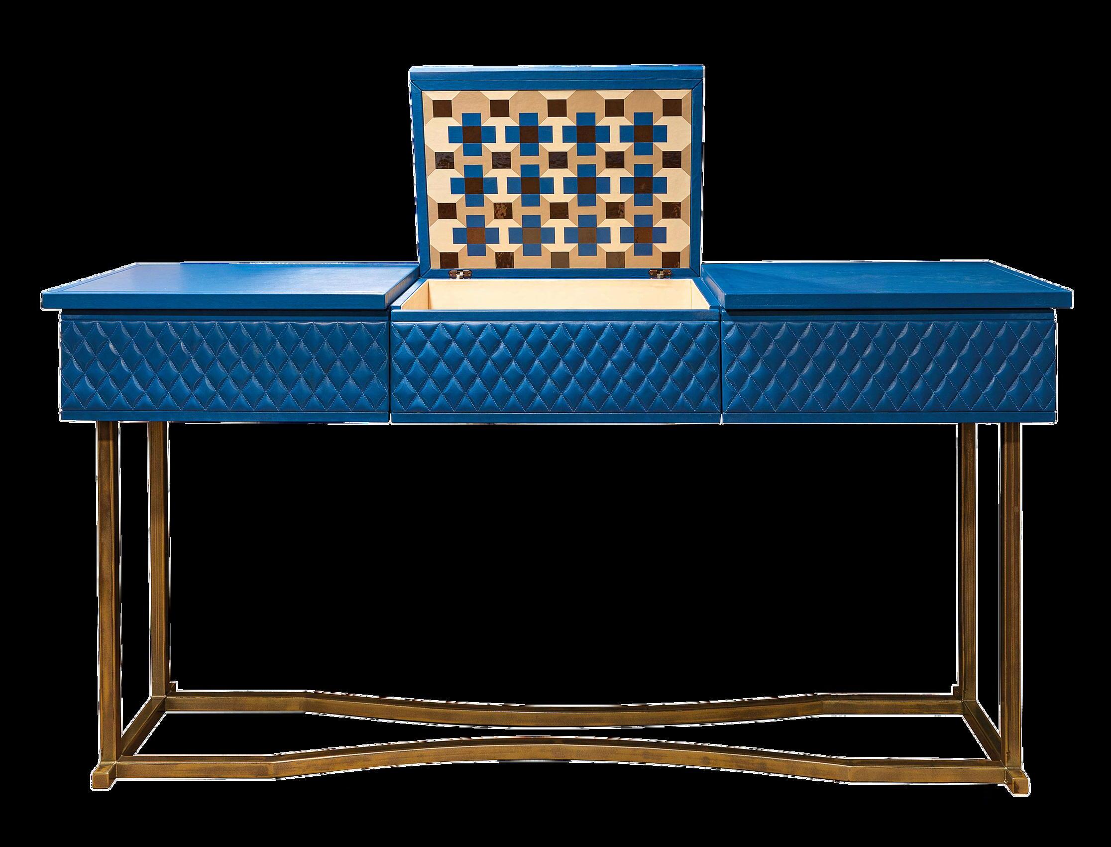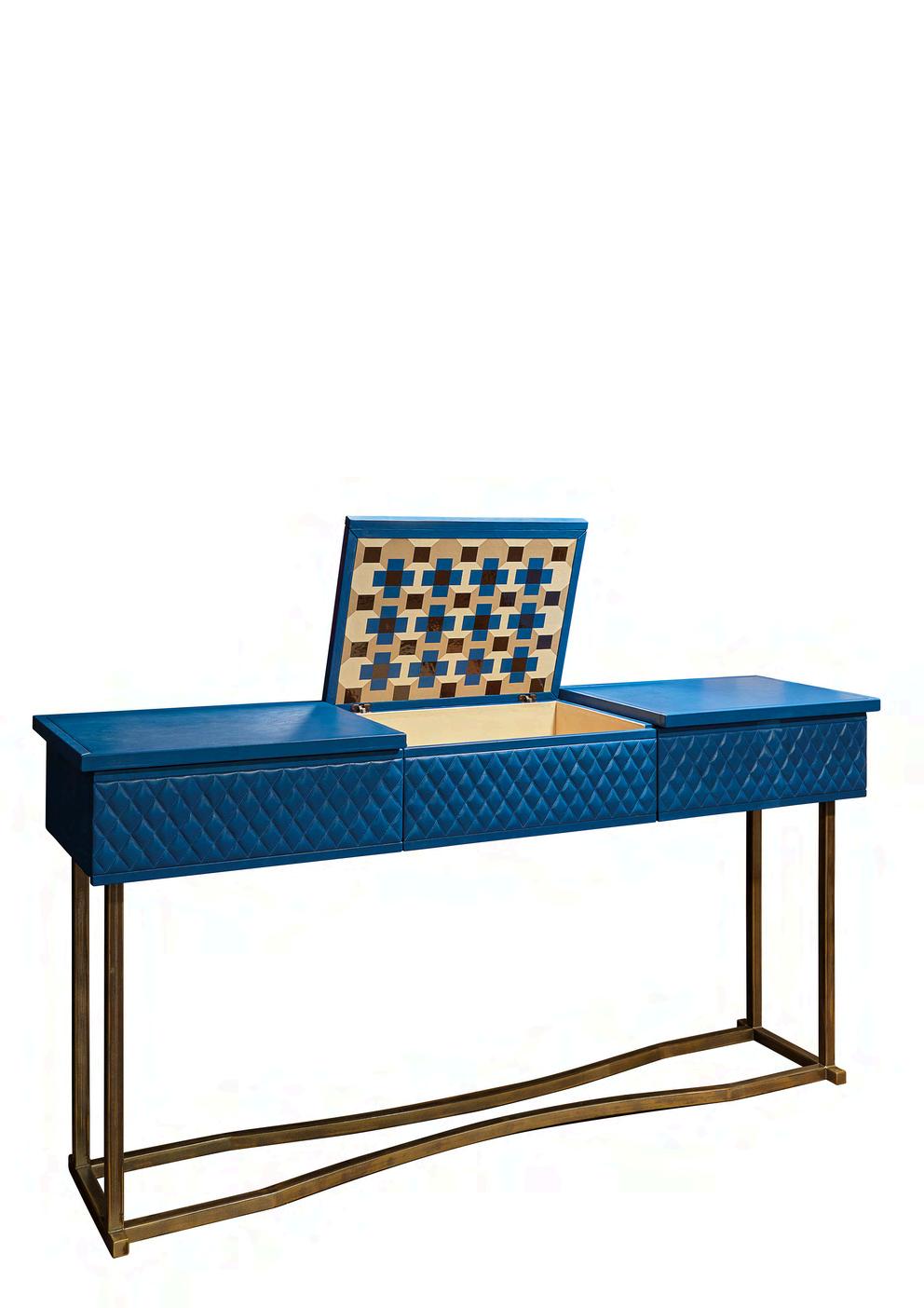 This console stands out for its slim and essential line, highlighted by extremely refined matelassé work, created on the drawer fronts through three-dimensional diamond shapes, sewn with coordinated colors.
