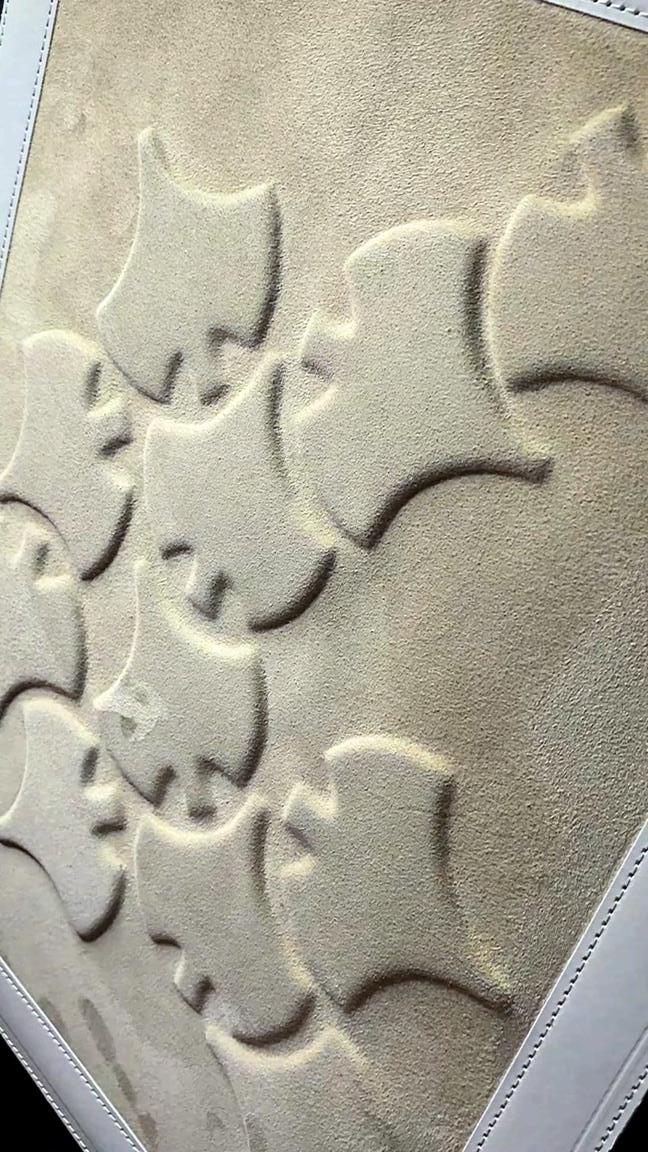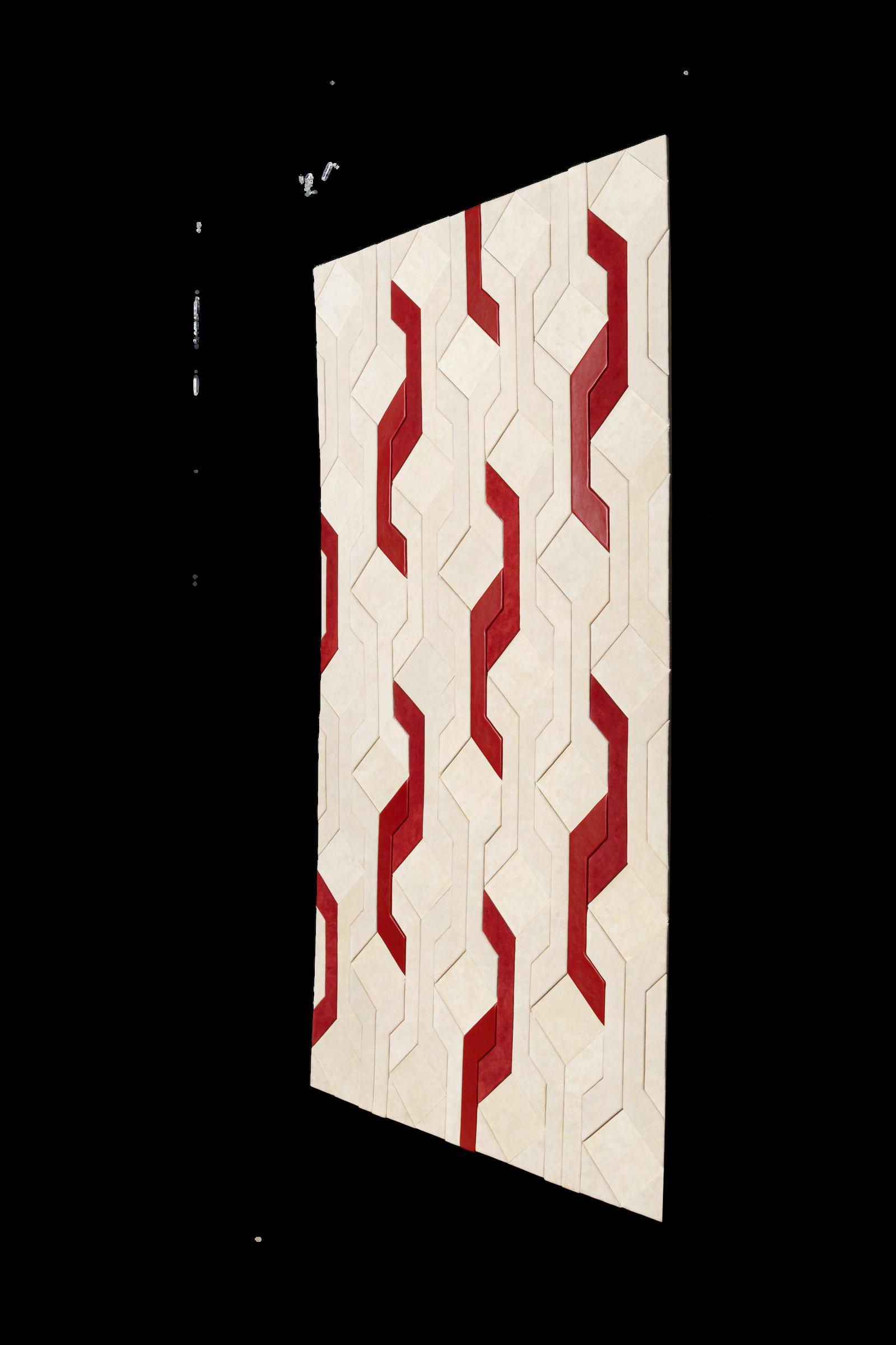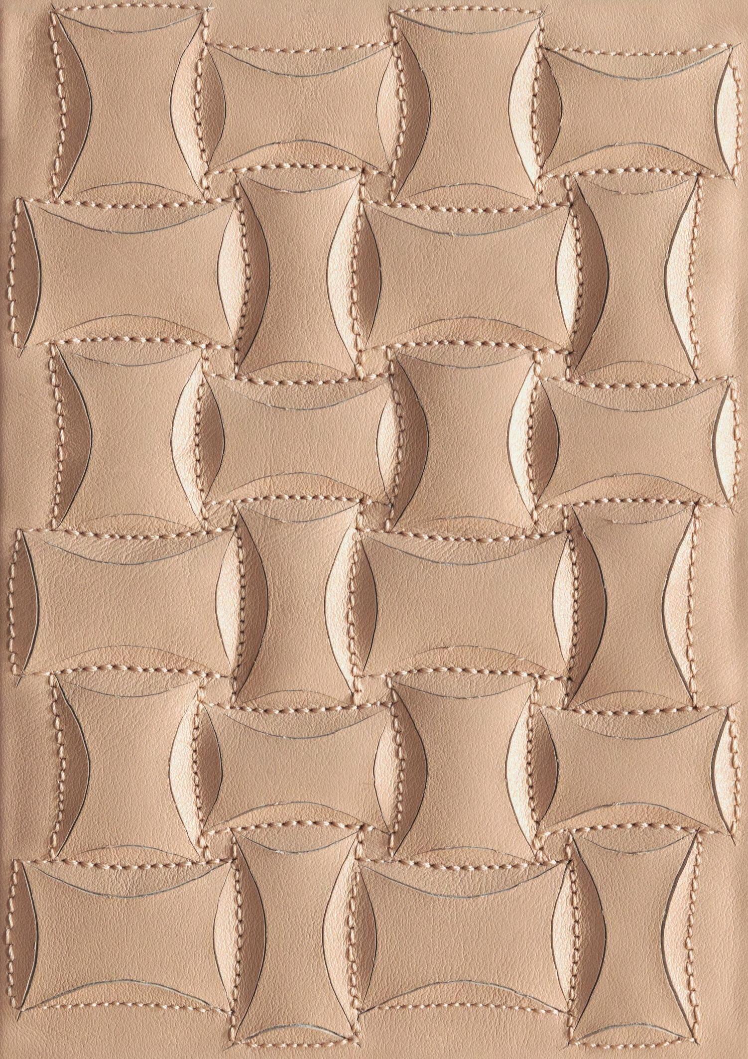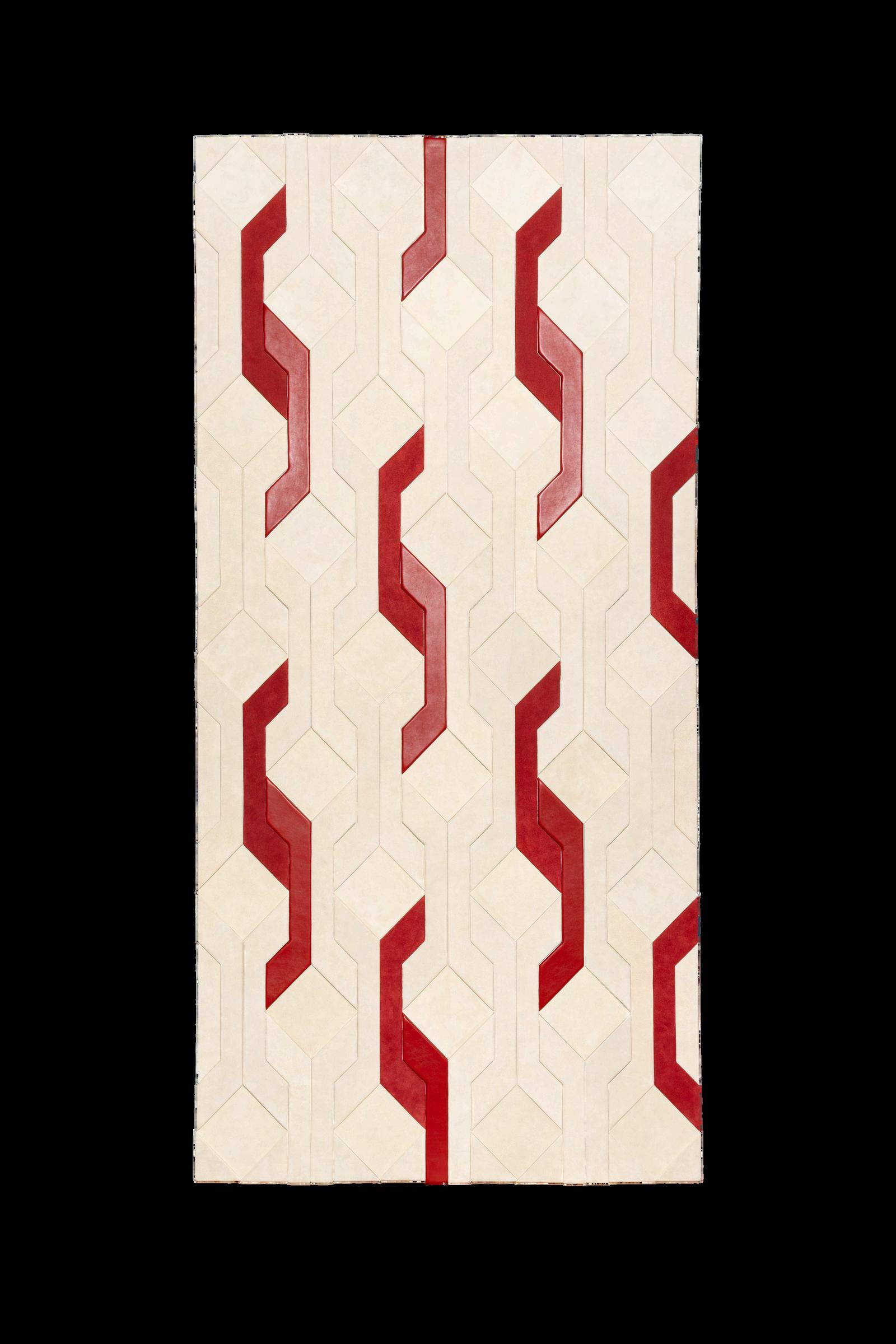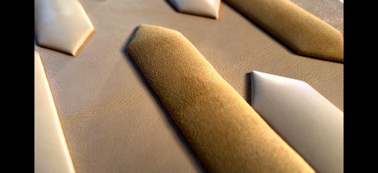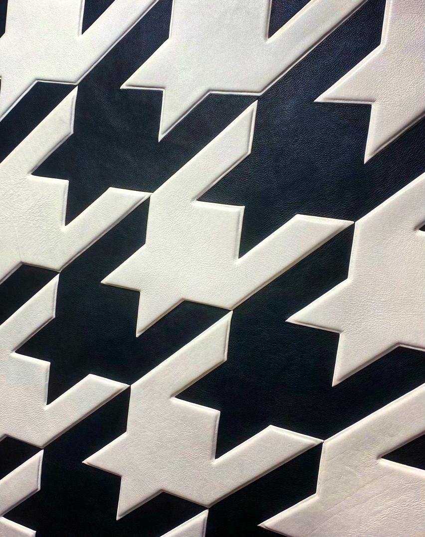 The gluing method is extremely accurate: special adhesives are used that ensure perfect adhesion while maintaining the natural softness and plasticityofthematerial.Theresultisathree-dimensionalpaneldeveloped on four depth levels, which transforms the leather from a two-dimensional materialintoasculpturalsurfaceofgreatcomplexity.