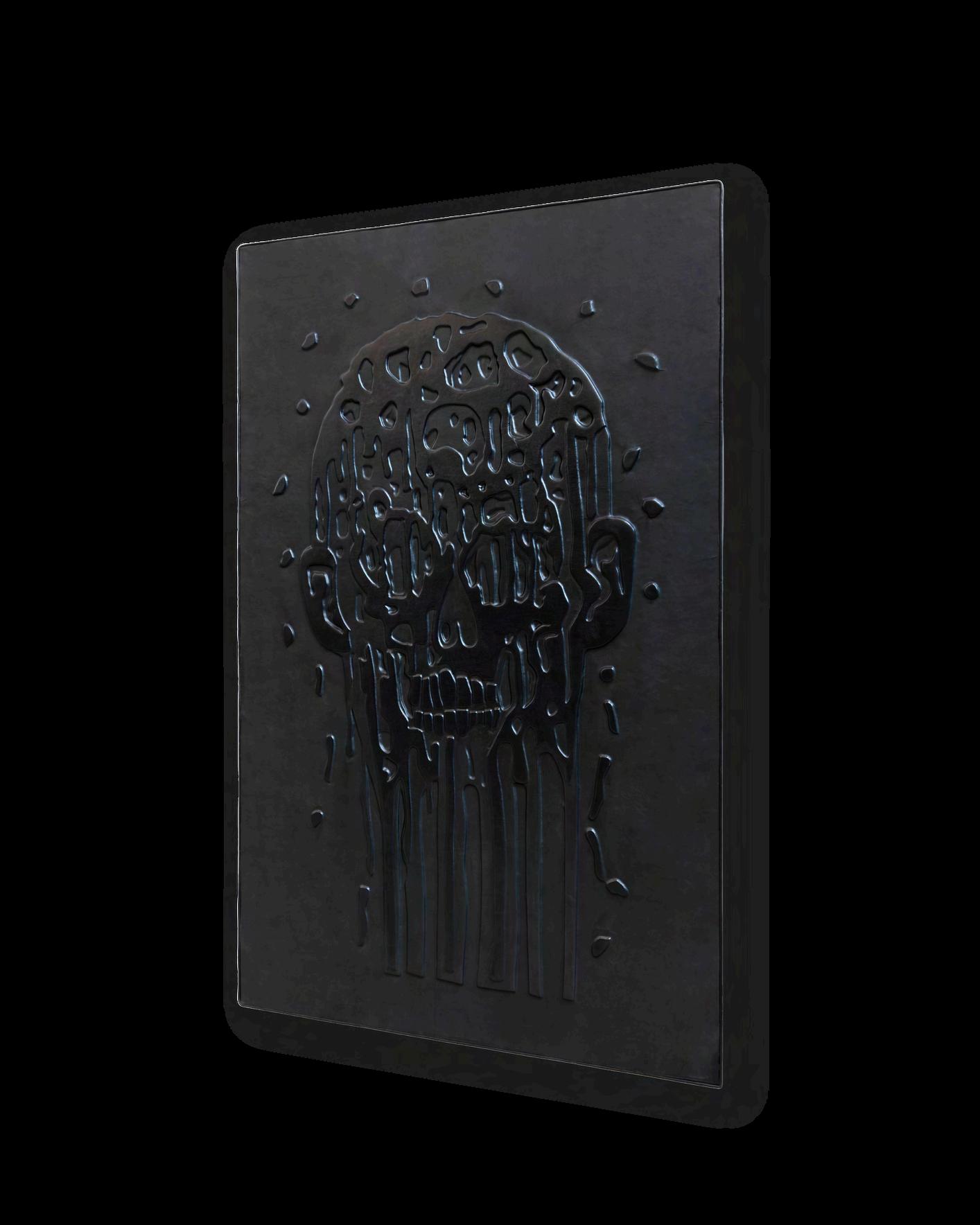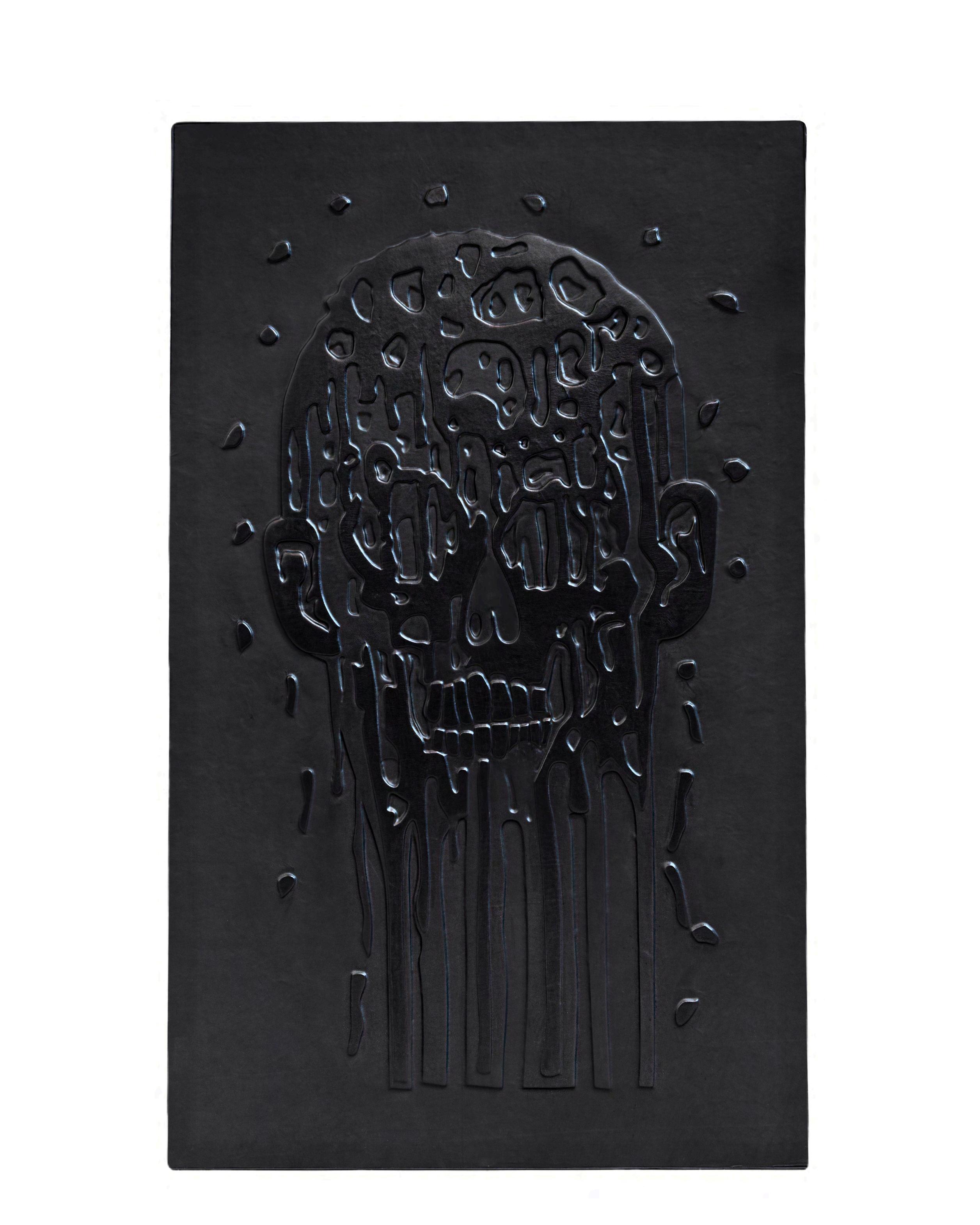 Thereliefworkandmanualapplicationofgoldleafontheleatherspotsadds furtherpreciousnesstothework,capturingandreflectinglightdynamically.