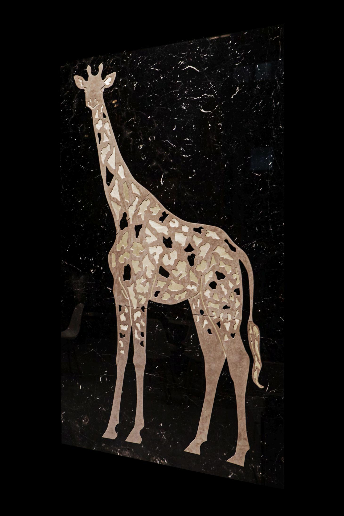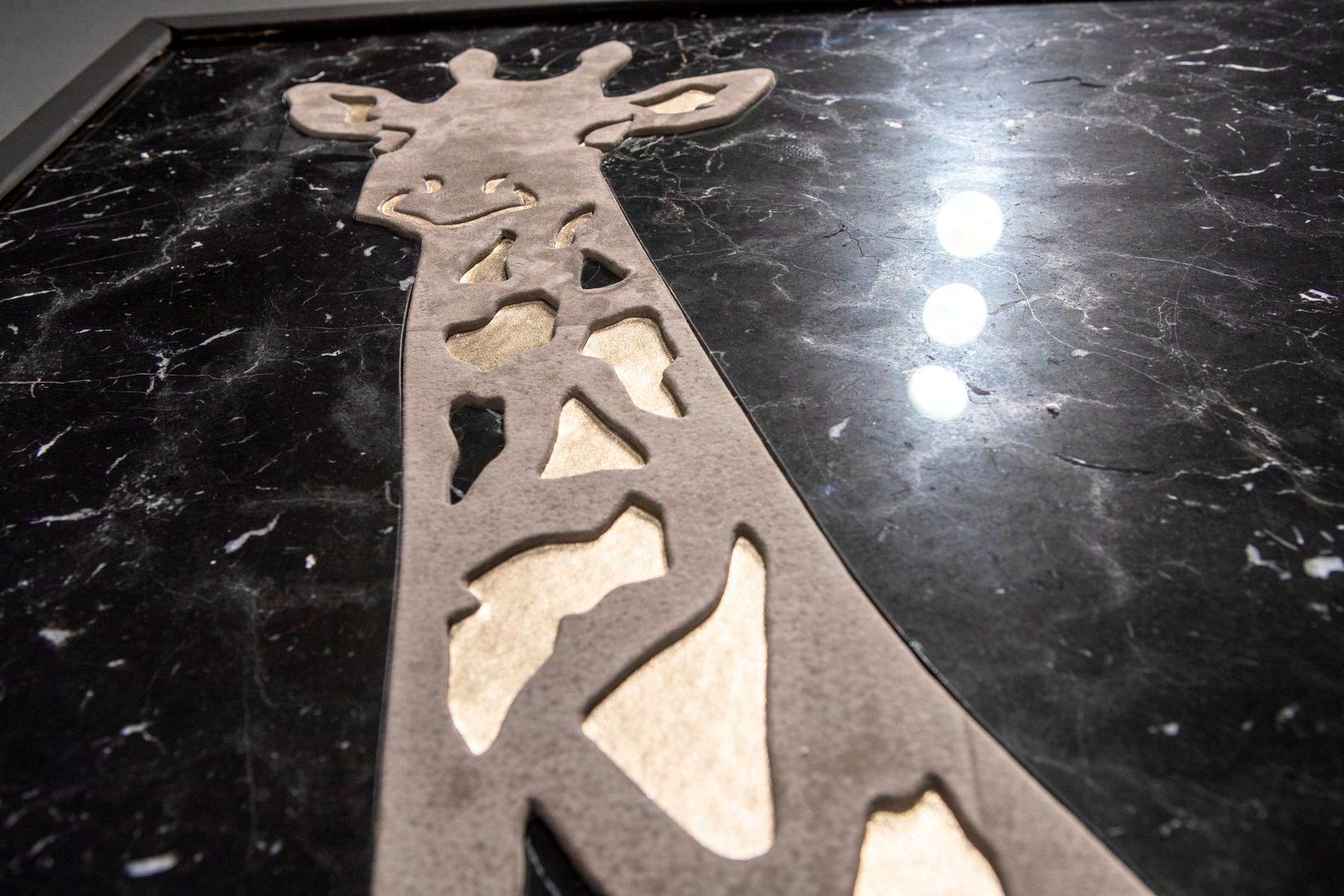 Thecreationtechniqueisparticularlycomplex:thegiraffeemergesfromthe panel through refined three-dimensional crafting that places it on a higher thickness level, giving it an almost sculptural presence in space. The characteristicspotsoftheanimalhavebeenrecreatedthroughamasterful alternationofinserts:somearemadewiththesameblackMarquiniamarble, others with gold laminated leather, creating a fascinating interplay of materialandluminouscontrasts.