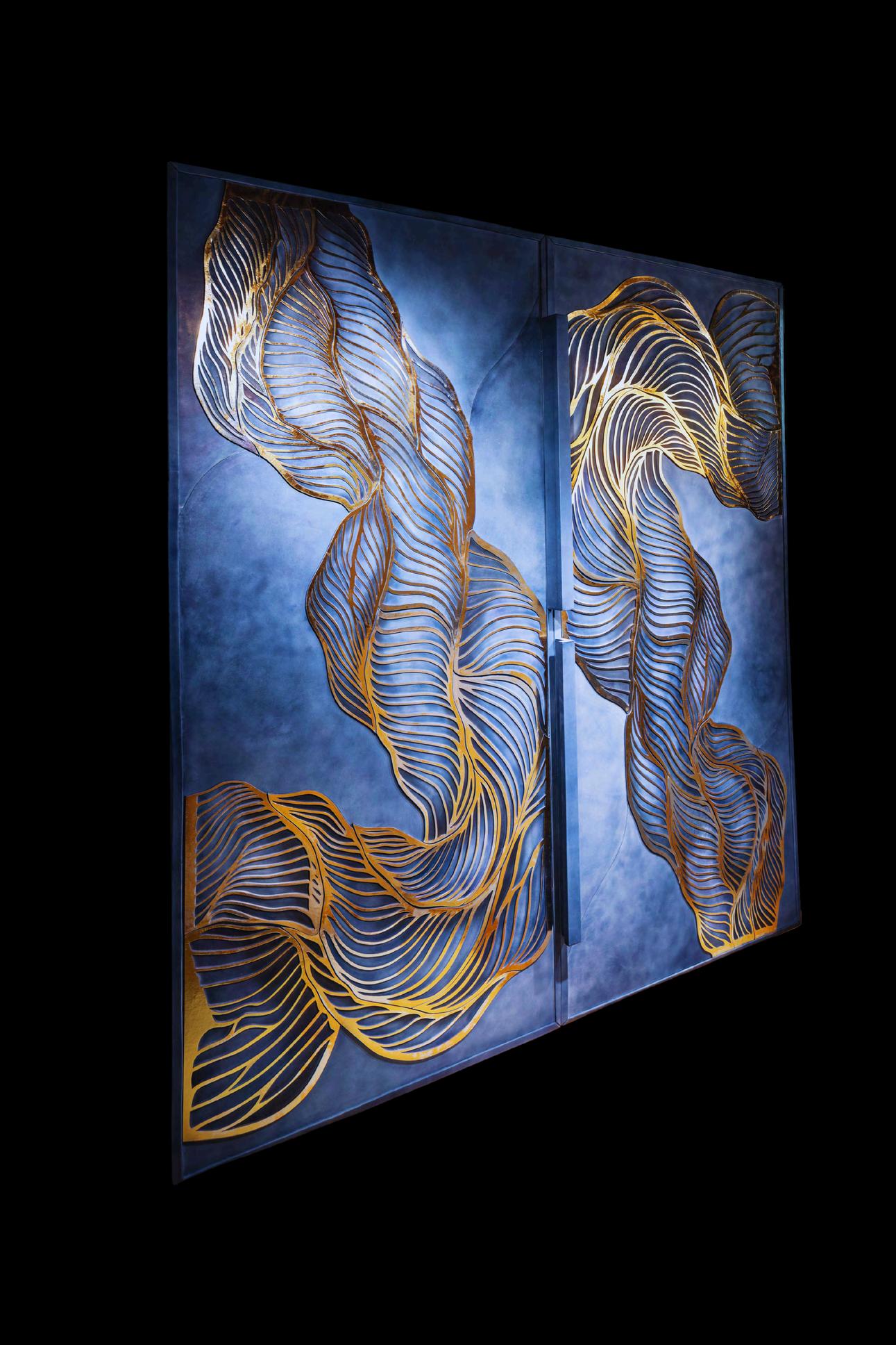 The sumptuous panels arise from the use of high-relief technique on semiprocessed leather. The three-dimensional effect is further enhanced throughtheapplicationoflaminatedsheetsinthreedifferentshades,which, combined with the precision of strictly manual processing, give life to an idealized decorative motif: a drapery of fabric moved by the wind. This recalls the elegant decorations of Arab textiles, where the movements of fabricsareoftenmetaphorsforspiritualmovementandfreedom.