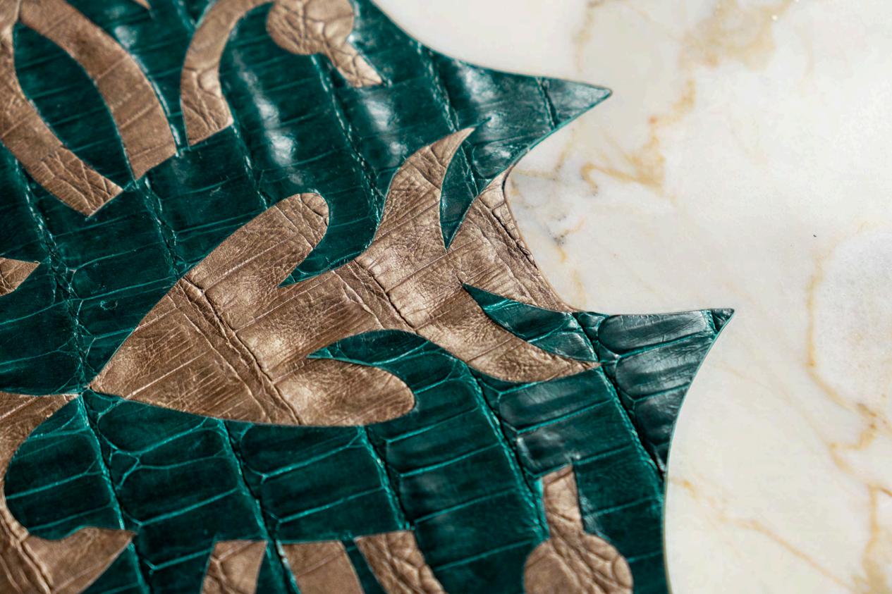Thesettingofpreciouscaimanleatherinmarblerecallsthehighestjewelrymaking techniques, where precious stones are inserted with millimetric precision.Inthiscase,twonaturalmaterialsareunitedwithsuchattention that their separation seems almost impossible, creating a compositional unitythatsurpassesthesumofitsindividualelements.