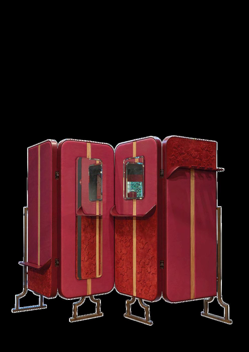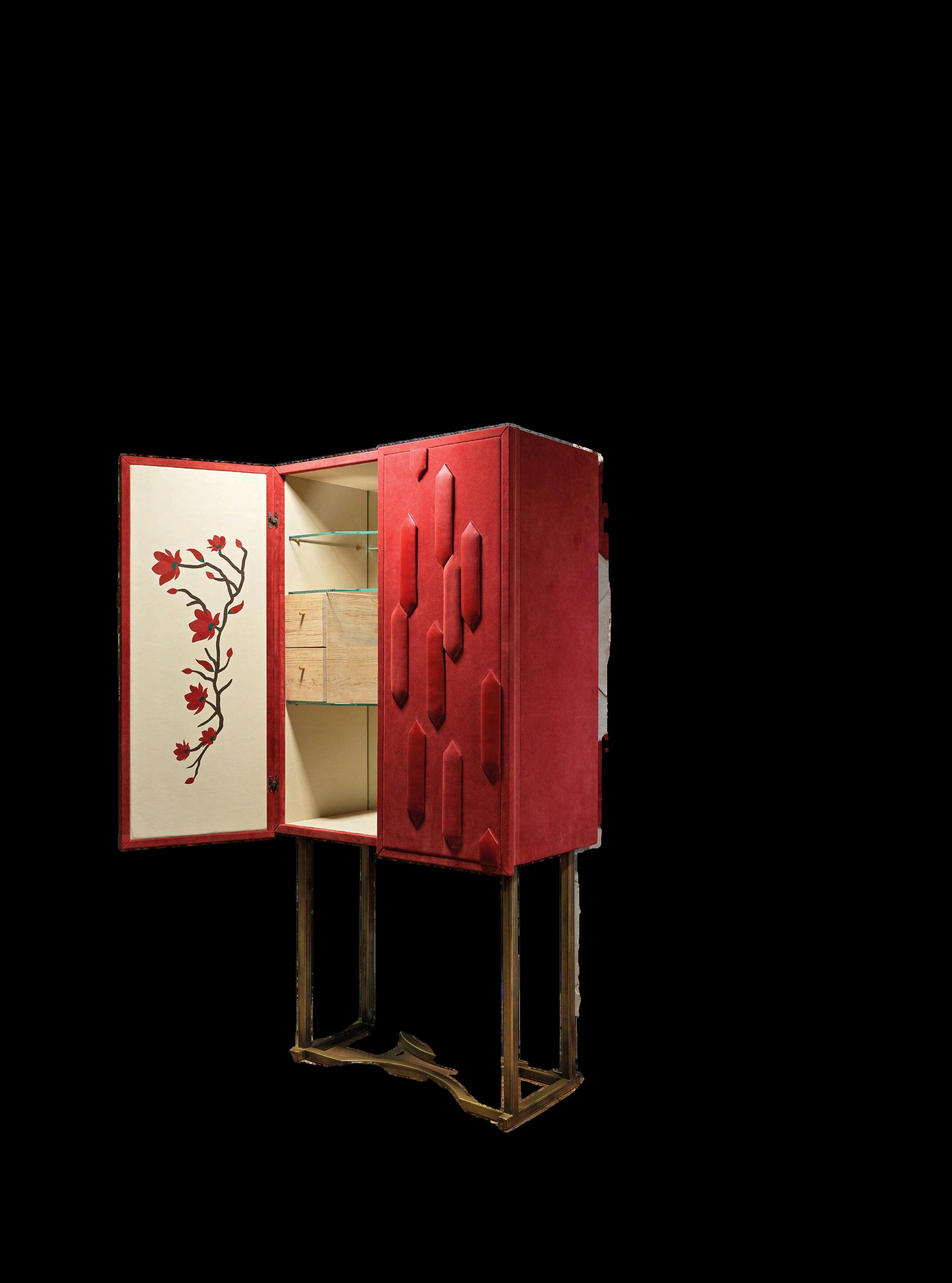 This elegant bar cabinet is characterized by doors decoratedwithtwodifferenttypesofbovinenappa leather: one smooth and one suede, both in an intenseshadeofred.
