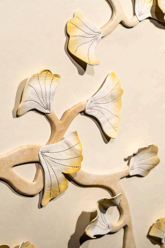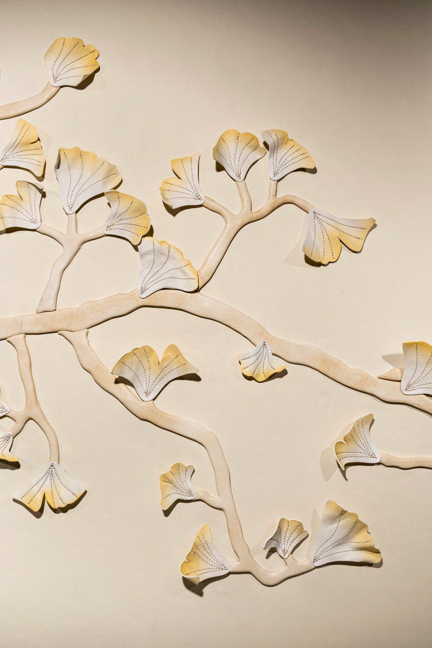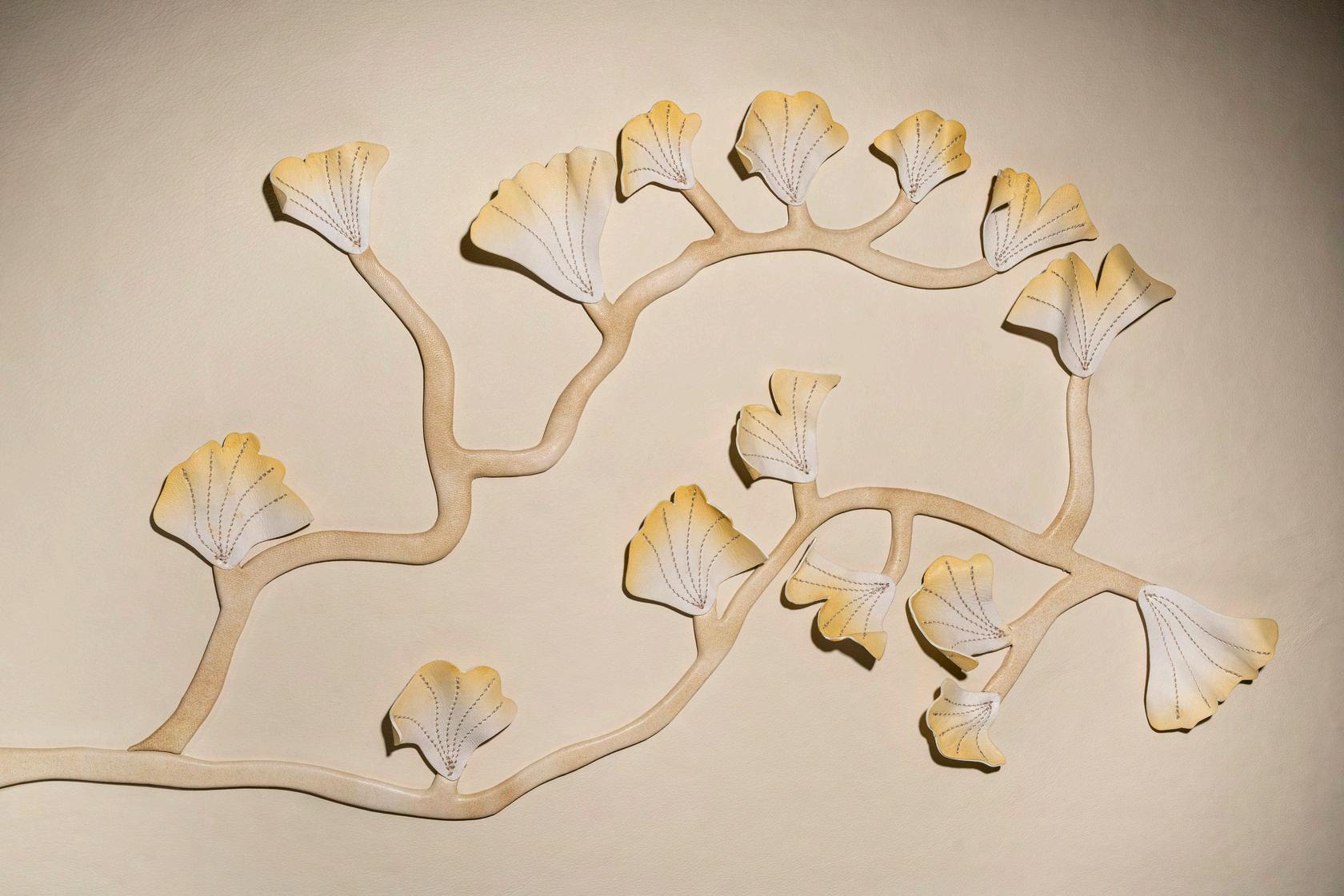 The composition is constructed through individually created and applied modules: the branches are made of soft sheepskin, skillfully modeled to convey a sensation of naturalness and movement. Each ginkgo leaf - a symbol of resilience and longevity - has been meticulously shaped, handpainted, and sewn onto the branches, creating an effect of incredible realismandrefinement.