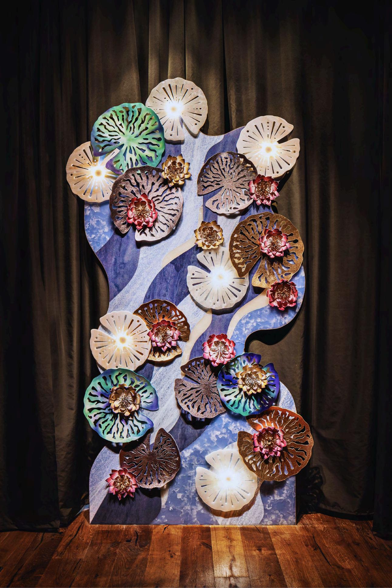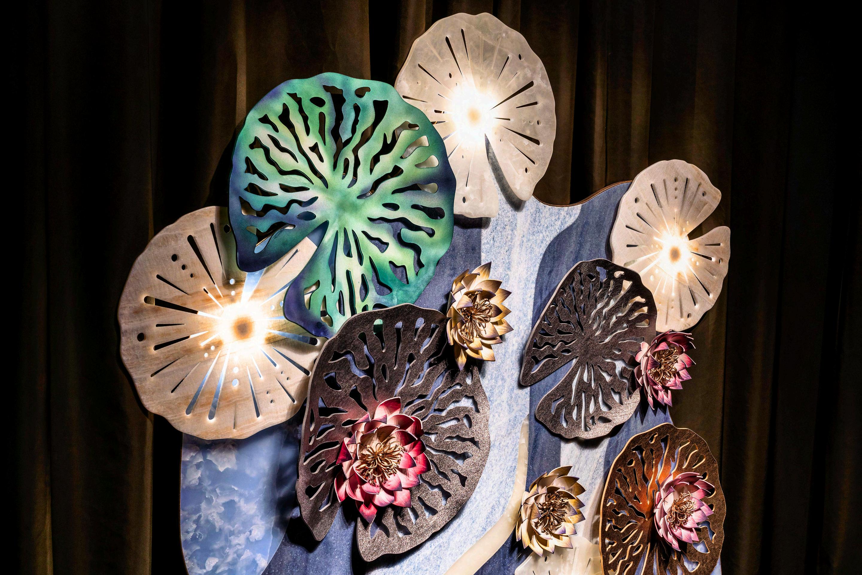 ThesculpturedrawsinspirationfromClaudeMonet's impressionistmasterpiece"WaterLilies."Theartist's canvasmaterializesinaverticalinstallation,a modernreinterpretationofawatermirroradorned withlotusflowersandwaterlilies.